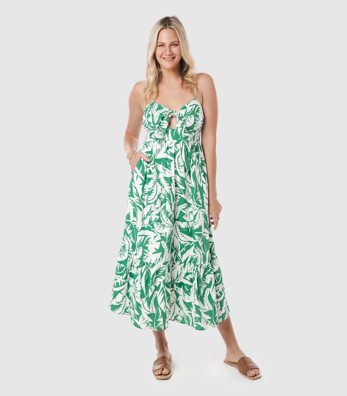 Introducing our Midi Dress by Piping Hot! This dress is a must-have for any occasion. Made from a lightweight and breathable cotton fabric, it offers a comfortable and regular fit. The dress features a stunning green tropical print, adding a touch of summer vibes to your look. It comes with a V-neckline and thin adjustable shoulder straps for a perfect fit. The tie front detail adds a chic and stylish touch. You'll love the convenience of the side pockets. With a midi length and a straight hemline, this dress flatters your figure and gives you a feminine silhouette. The elastic shirred back panel ensures a comfortable and secure fit. Pair it with your favourite sandals or heels, and you're ready to turn heads wherever you go. Make a stylish statement with our Midi Dress from Piping Hot today!