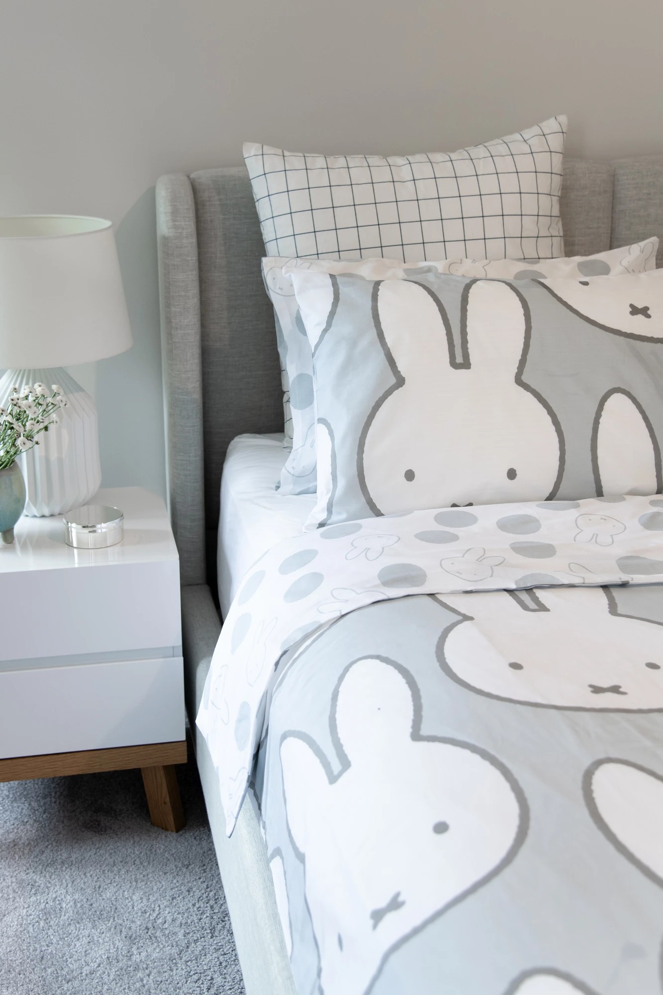 Enhance your child's bedroom with the charming Miffy Kids Quilt Cover Set in grey. Made from soft cotton with a 180 thread count, featuring an adorable Miffy print, it brings joy and whimsy to any room. The reversible design allows for a quick change of style, and the machine-washable fabric makes it easy to maintain. Suitable for both single and double beds, each set includes the necessary quilt covers and pillowcases. Give your little one's room a delightful upgrade today!