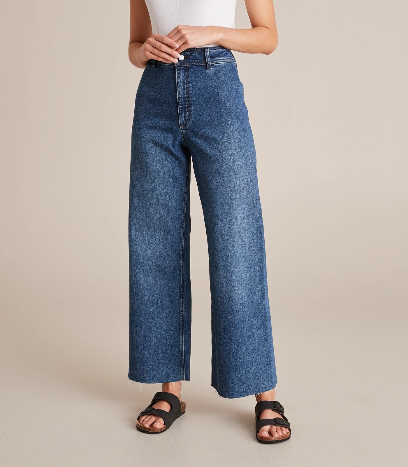 The Mila full length denim jeans features a super high rise waist, a wide leg and a stretch cotton fabrication for comfort and breathability.