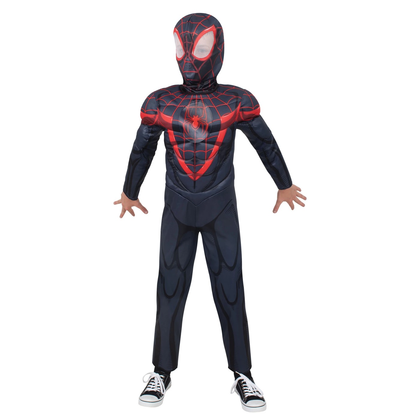 Unleash your child's inner hero with the Miles Morales Deluxe Lenticular Kids Costume! Watch them swing into action as Spider-Man in the deluxe black jumpsuit, complete with fibre-filled muscles. The standout red lenticular graphic Spider badge adds authenticity. Perfect for dressing up and playtime, let your child experience the excitement of becoming a beloved Marvel character. Get ready for epic adventures and save the day in style with Miles Morales!