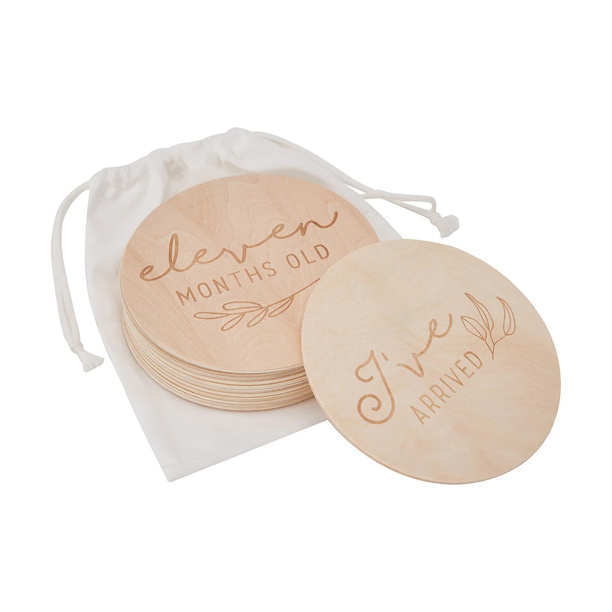 Capture those precious moments effortlessly with our Milestone Discs set. Featuring fourteen beautifully designed plywood discs, this set comes complete with a handy storage bag, making it easy to keep all your memories organised. The discs are a charming brown colour, adding a touch of class to each milestone photo. Sized perfectly to fit into your baby's hand, each disc is not just a keepsake but also a delightful way to document and share your baby's growth. Take home this delightful set and let it become a cherished part of your family journey. Ideal for new parents, it also makes a thoughtful gift. Don't miss the chance to capture every milestone!