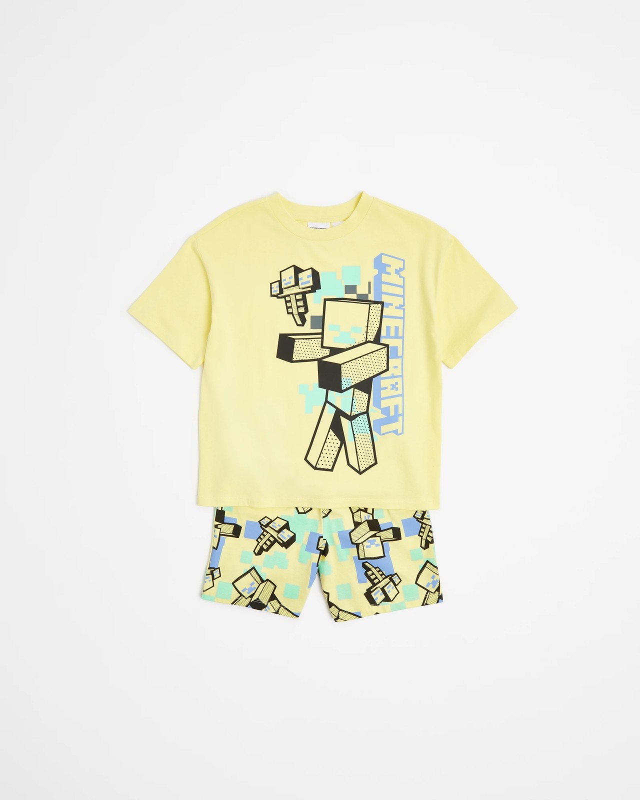 Discover the perfect sleep set for boys with this Minecraft two piece pyjama set. Crafted from a soft cotton fabric, this regular fit set includes a yellow ribbed crew neck top with short sleeves and large Minecraft print to the chest, finished with a straight hem. The matching all-over print shorts feature an elastic waistband for extra comfort. Let him drift off into sweet dreams in style!