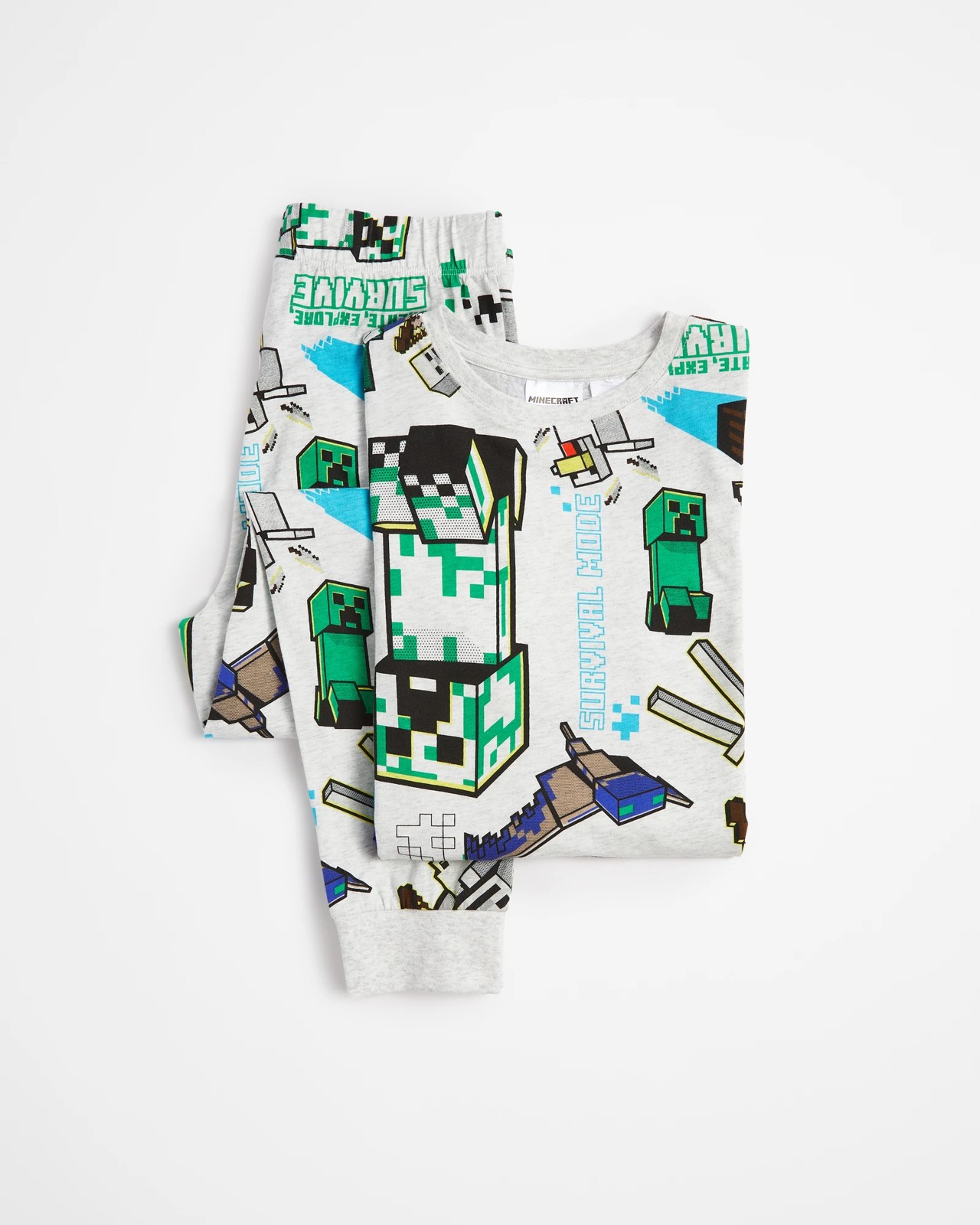 Send your little one off to dreamland in this cosy Minecraft Cotton Pyjama Set. Designed for all-night comfort, this set is made with a grey, cotton-rich fabric with an all-over Minecraft print that fans will adore. The ribbed crew neck and cuffs on the long sleeves provide a snug fit, while the straight hem and matching print pants ensure they stay cosy and warm throughout the night. Whether they're building in their dreams or just snuggling up for story time, this pyjama set is the perfect addition to their night-time routine.