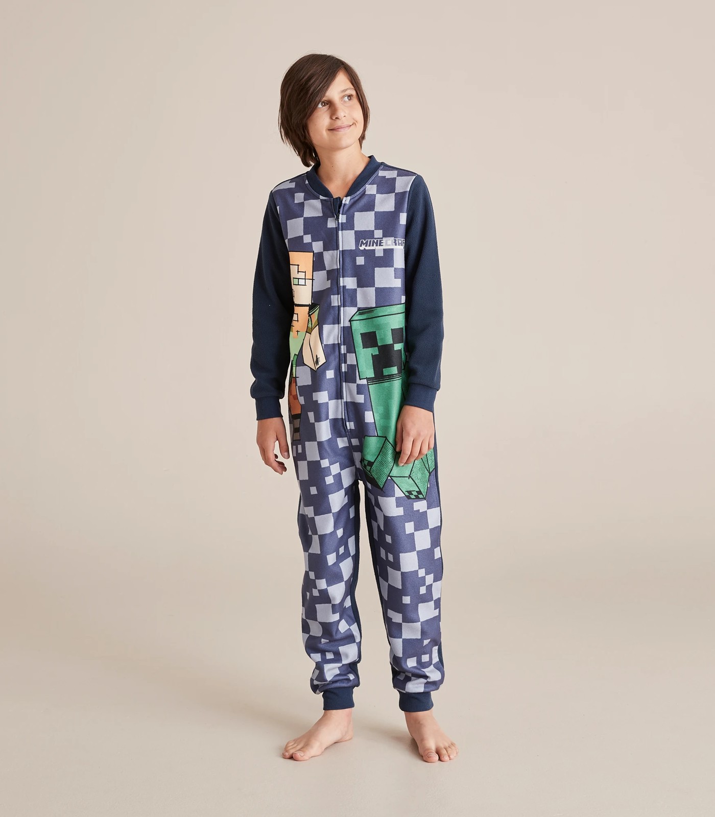 Fans will sleep blissfully in the navy blue Minecraft Fleece Sleepsuit, featuring a ribbed crew neck, long sleeves with zip front and Minecraft prints to front of body.