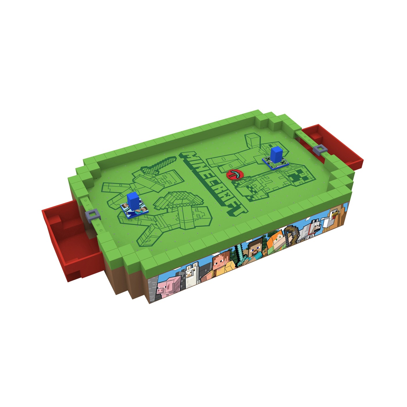 Bring the thrill & excitement of the arcade home with the arcade air hockey game! For years, air hockey has captivated arcade visitors of all ages as the puck glides and rebounds over the table surface at incredible speeds. This set offers all of the fun in a compact set! Just like the full size version, you need to knock the puck into your opponents goal. Turn the machine on to start the air flow, and see the puck start to magically hover around the playing surface. Challenge a friend and start your game! Shoot directly at the goal or bounce it off one of the walls to confuse your opponent and increase the odds to score. Features classic Minecraft music.