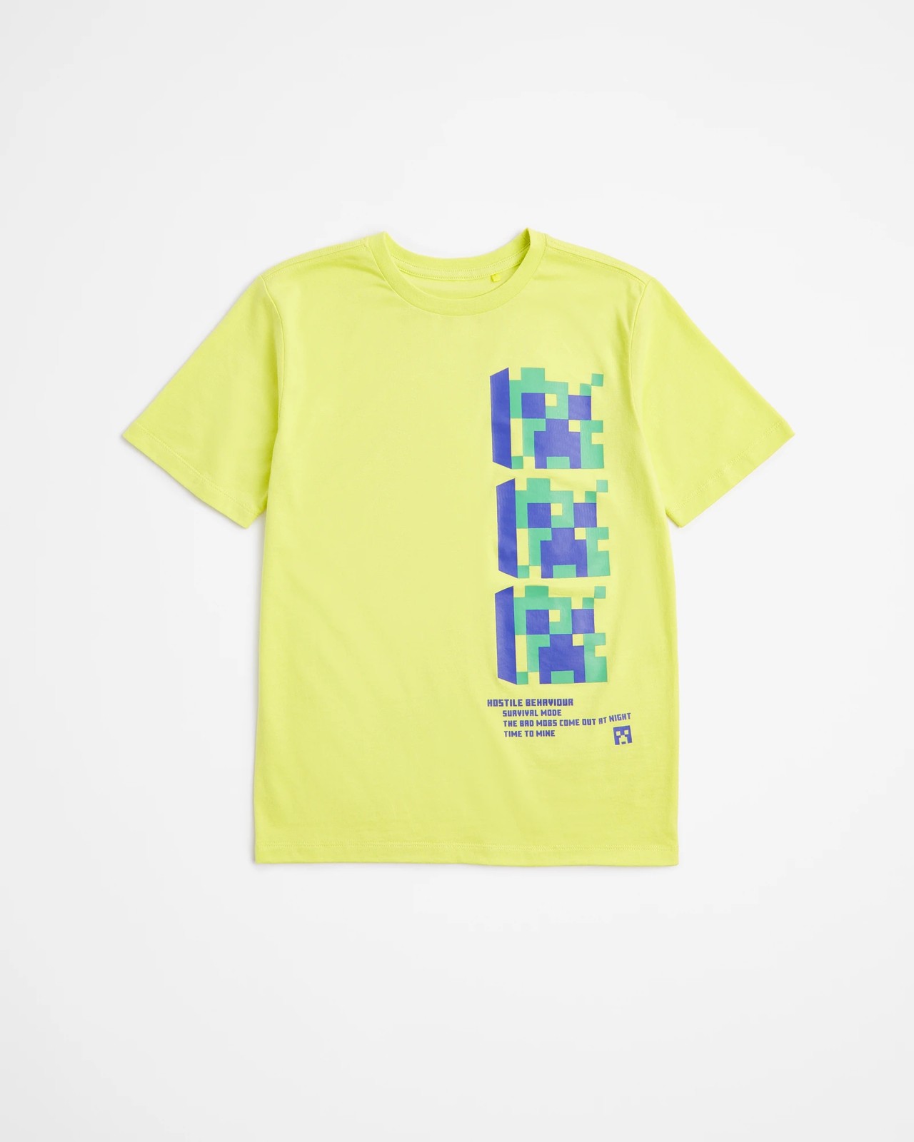 This boys' Minecraft T-shirt is made from soft cotton for all day comfort. The regular fit cut features a ribbed crew neck, short sleeves and a straight hem. The design is finished with a large Minecraft print to the front in yellow, making it an ideal choice for any fan of the game. Perfect for pairing with jeans or shorts for an easy everyday look.