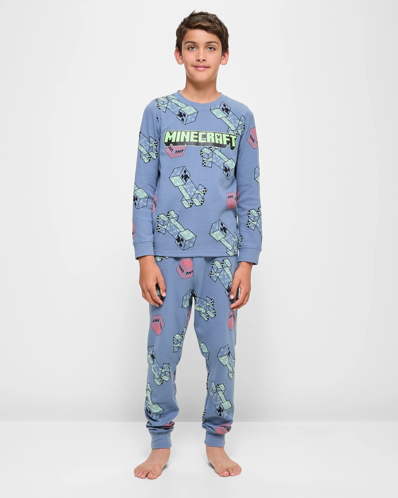 Your child will drift off to sleep in style with this delightful Minecraft Waffle Pyjama Set. Made from soft cotton, this cosy set features a quirky waffle texture and an all-over Minecraft print that fans of the game will adore. The top has a comfortable round neck with rib trim and long sleeves for added warmth, while the matching bottoms come with an elastic waistband and rib cuffs for a snug fit. Perfect for a good night's rest, this pyjama set is an ideal bedtime companion for your little gamer. Add to their night-time wardrobe today!
