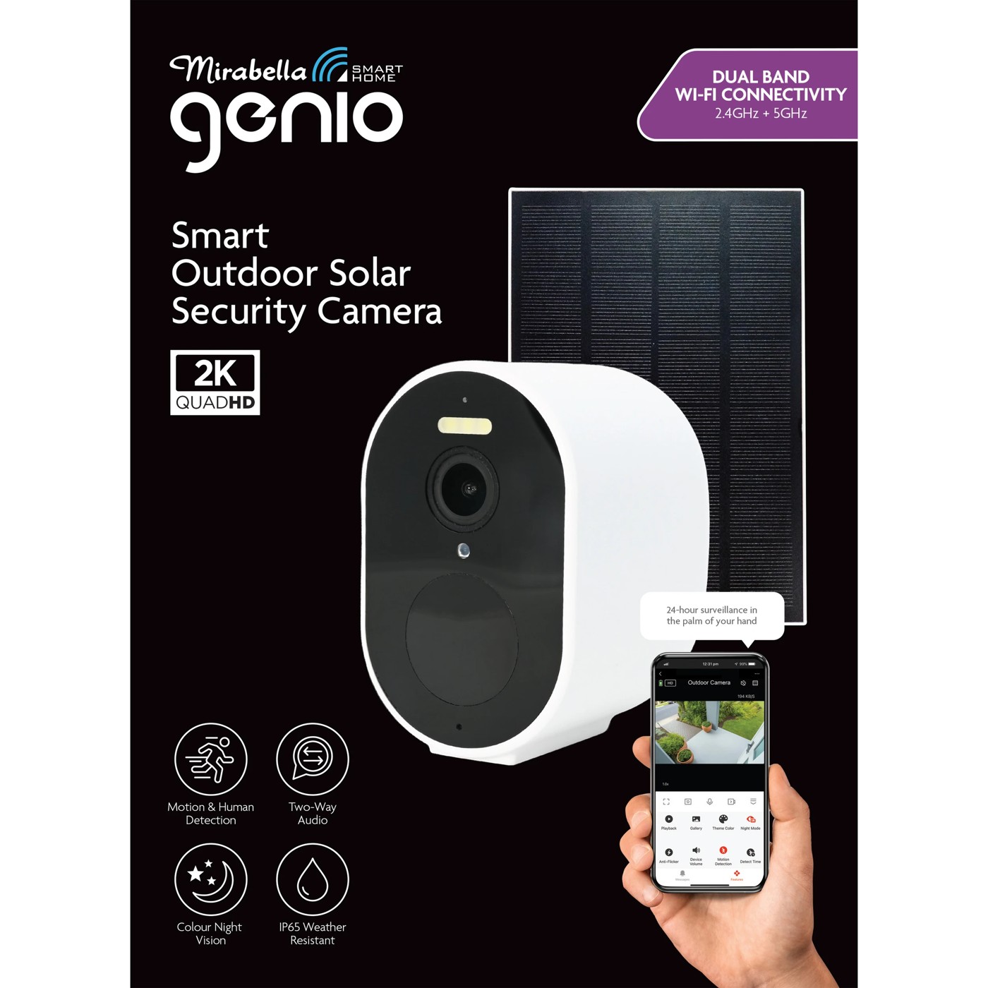 Stay aware, stay connected and keep every corner of your home protected — anytime, anywhere.The Mirabella Genio Smart Outdoor Camera delivers peace of mind with powerful, easy-to-use features designed to help you see more and worry less. With Dual Band Wi-Fi and crisp 2K Quad HD resolution, you’ll see every detail clearly — even after dark thanks to colour night vision and an integrated spotlight that activates when motion is detected. Smarter motion and human detection helps cut down unwanted alerts, while activity zones, two-way audio and a 120deg. wide viewing angle give you full control of your space.Use two-way audio to speak or listen, set activity zones to focus on what matters, record footage with a microSD card (required, not included) and activate the built-in siren for extra protection. With an IP65 weather-resistant rating for reliable year-round protection.Simple, smart and always within reach — stay in control from anywhere with the Mirabella Genio app.