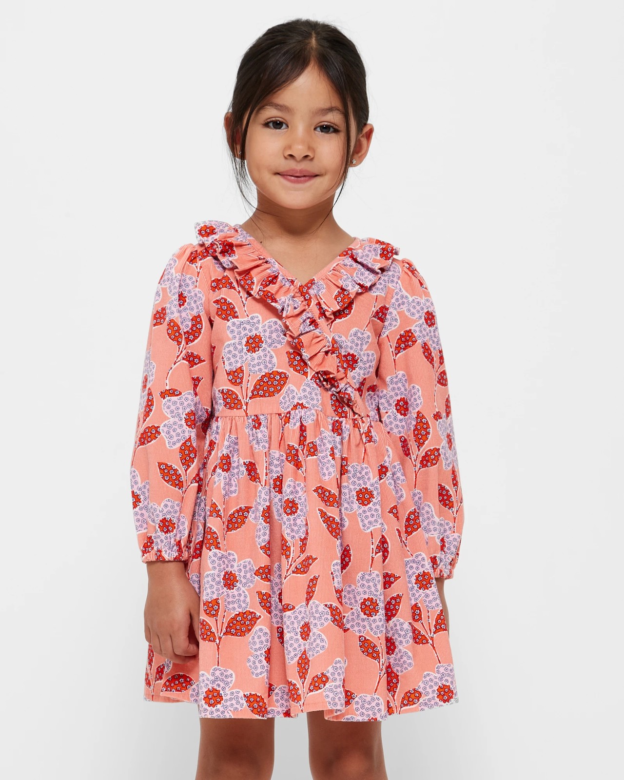 Elevate her style with our Mock Wrap Long Sleeve Cord Dress. This charming dress features a faux wrap frill V-neck, long sleeves with elastic cuffs, and a gathered elastic waistband for a comfortable and flattering fit. The all-over print adds a playful touch, while the hidden back zip ensures easy dressing. Made from soft cotton cord, this dress offers a regular fit and an A-line silhouette that's perfect for any occasion. Treat her to a versatile and stylish dress that will keep her looking and feeling fabulous.