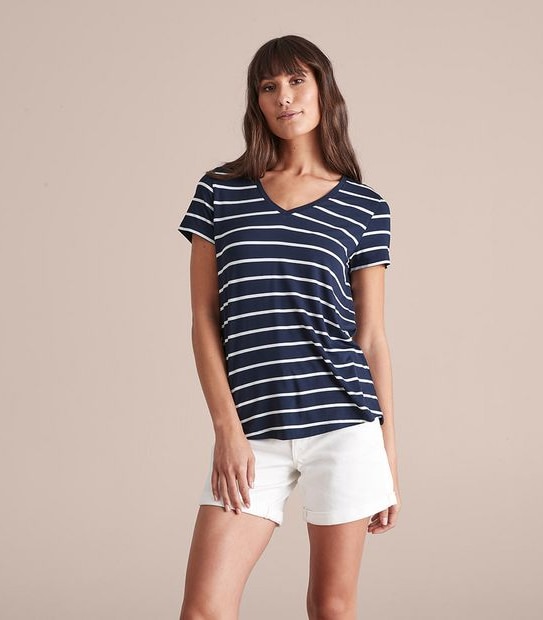 The perfect everyday wardrobe basic, the v-neck tee is great for layering, has a v-neckline and has stretch for comfort.