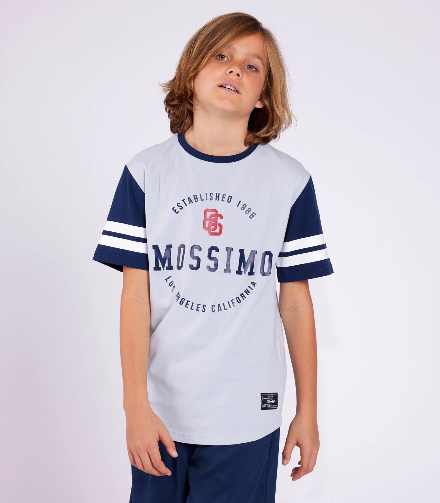 The perfect blend of comfort and style, the Mossimo Mission T-Shirt for boys is crafted from soft cotton and features a classic grey colour. It has a striking HD chest print, contrast colour sleeves and a woven badge on the hem. This stylish t-shirt will ensure he stands out from the crowd!