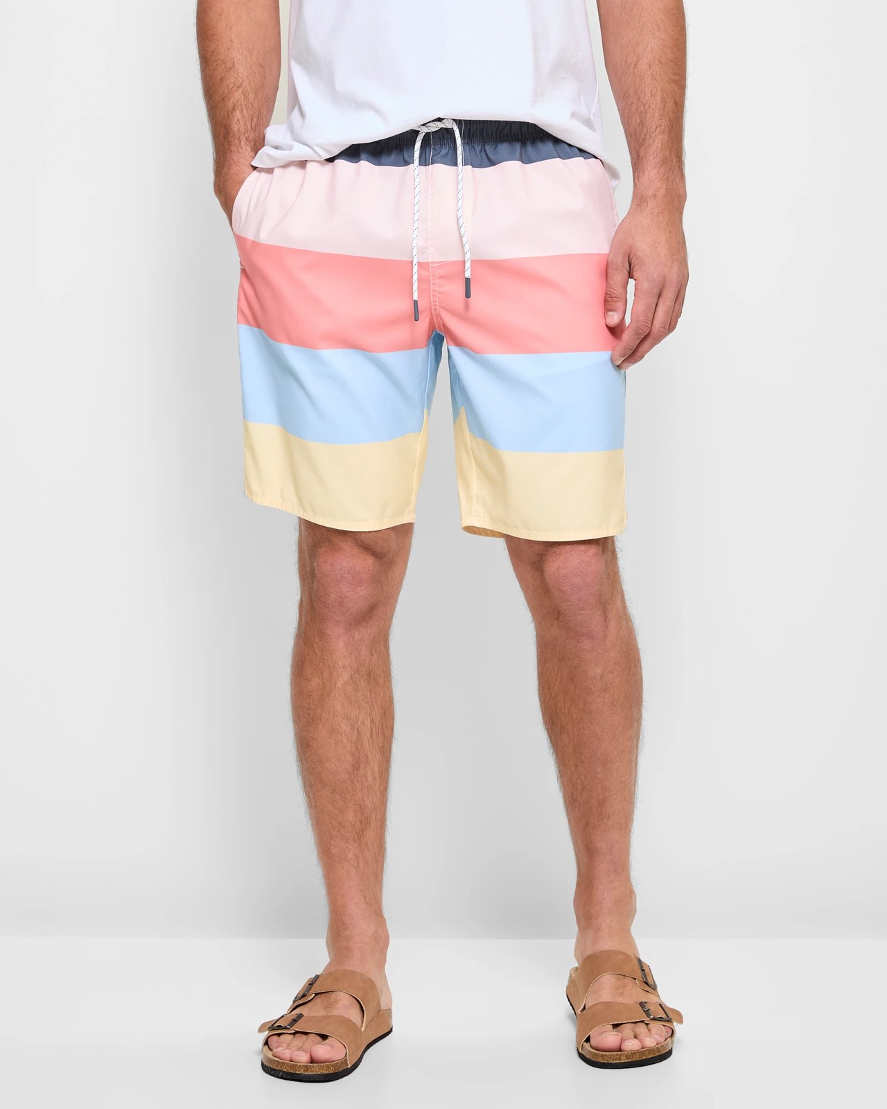 Unleash your summer spirit with our Multi Stripe Boardshorts, perfectly designed for style and comfort. These men's boardshorts feature a striking multicoloured stripe design that makes a bold statement. The thick elastic waistband with a drawstring ensures a secure fit, while practical side seam pockets and a back fold-over pocket offer ample storage. Dive into the waves or lounge by the pool in these versatile, short-length boardshorts. Refresh your beachwear game today!