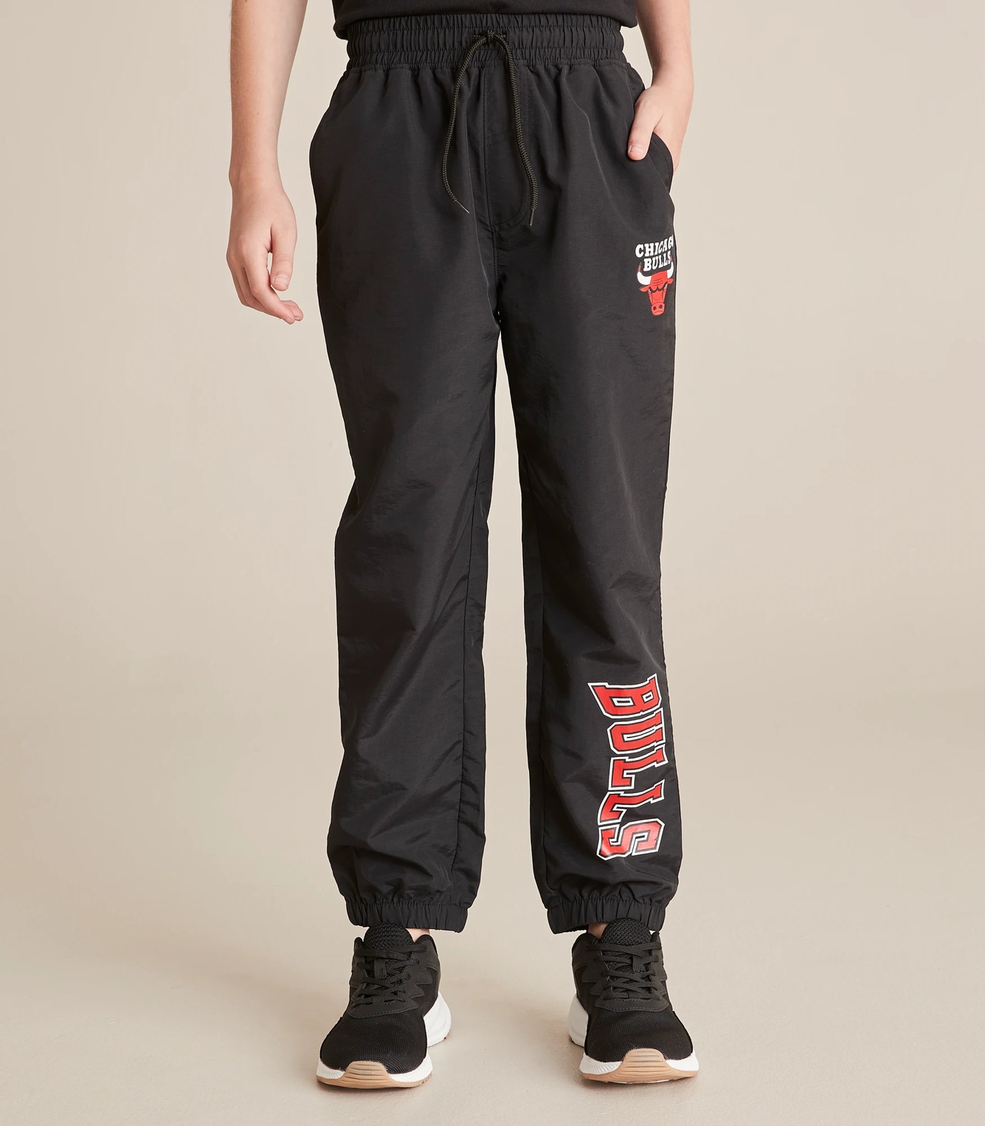 Basketball fans will love the black NBA Chicago Bulls Trackpants, featuring an elastic waistband with drawcord, side pockets and elastic cuffs.