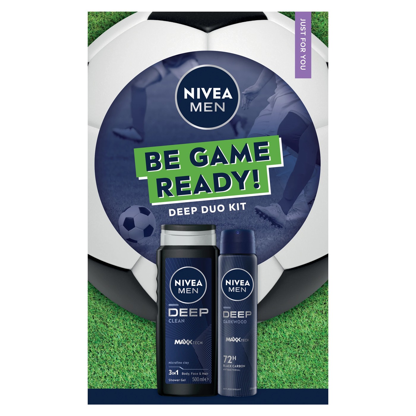 Nivea Men Deep Clean Shower Gel leaves your body, face and hair feeling deeply cleansed, perfect for men who want a deep clean and refreshed shower experience. The innovative formula powered with Maxxtech with natural-derived microfine clay absorbs impurities and cleanses your skin deeply, leaving a fresh skin feeling.Nivea Men Deep Darkwood Anti-Perspirant Aerosol protects your skin from sweat and bacteria for a long-lasting dryness and a clean skin feel, as if you’ve just stepped out of the shower. The effective anti-bacterial formula with black carbon and Maxxtech, works without leaving any visible black residue and is complemented by a modern and masculine Darkwood fragrance. Reliable 72 hour protection for a long-lasting dry and clean skin feeling, just like after a shower.