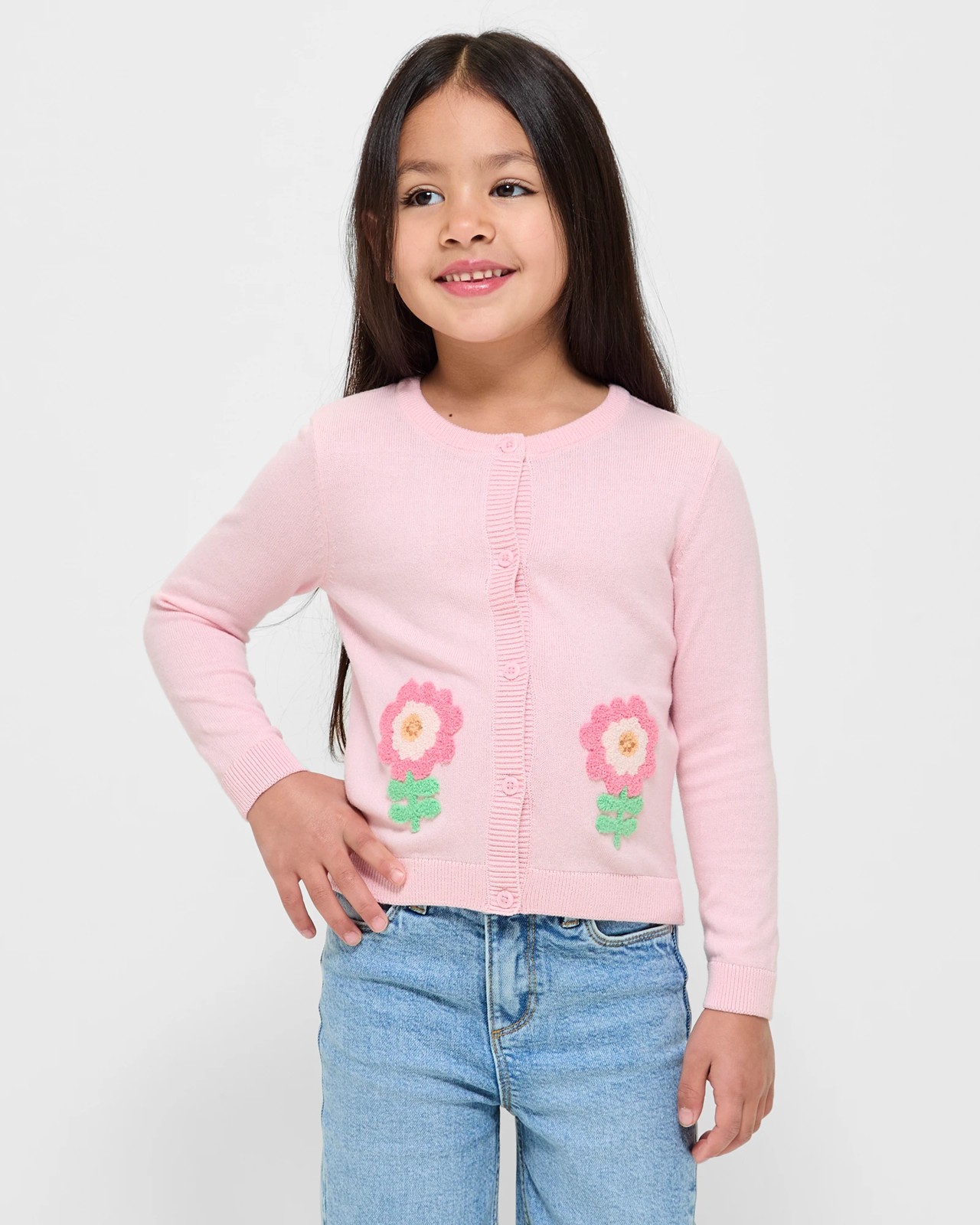 Wrap your little girl in elegance and comfort with our Novelty Boucle Knit Cardigan. Crafted from soft cotton knit, featuring charming boucle flower appliques on the front adding a playful touch. Styled with a crew neck and buttons for quick dressing, the cardigan promises a cosy fit, perfect for any occasion. Let her dance, play, and make memories effortlessly.