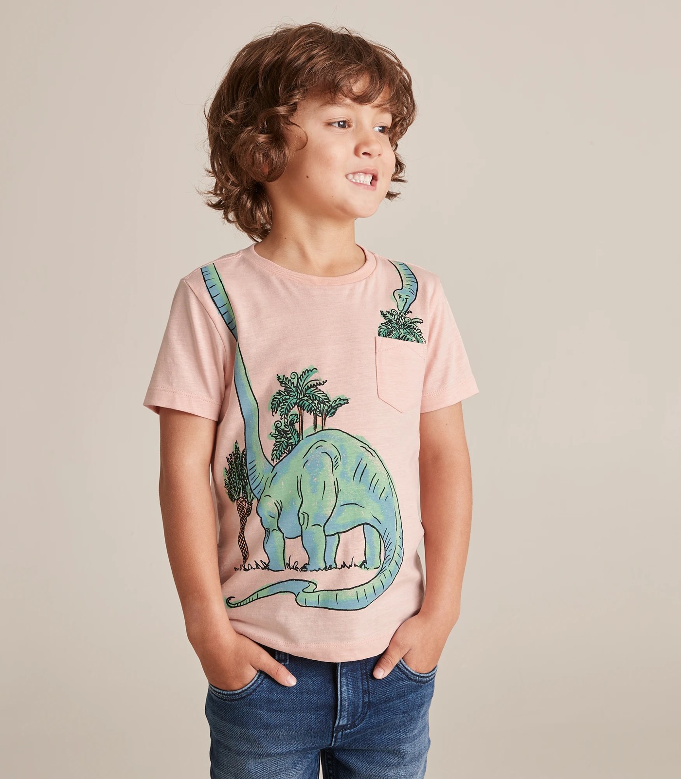 Crafted from soft cotton for all day comfort and with a large dinosaur print and chest pocket detailing they'll be sure to love comes the coral Novelty Dinosaur Print T-shirt.