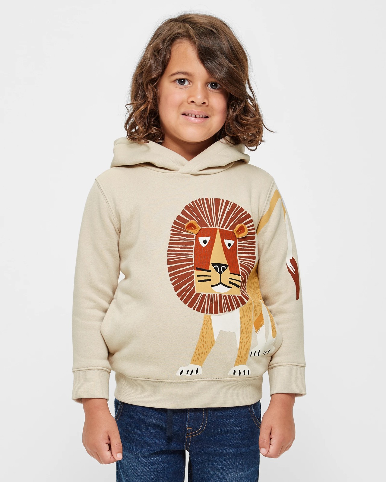Introducing our Novelty Lion Print Hoodie, a must-have for young boys! Made from a comfortable cotton-rich fabric, this hoodie is designed for a regular fit. It comes in a stylish cream shade with a hood and long sleeves featuring ribbed cuffs. The standout feature of this hoodie is the large Lion print on the front, complete with 3D ears that bring it to life! With side seam pockets and a straight ribbed hem, it is both practical and fashionable. The hoodie is fleece lined for extra warmth and cosiness. Make a statement with this cool and trendy hoodie. Get yours today!