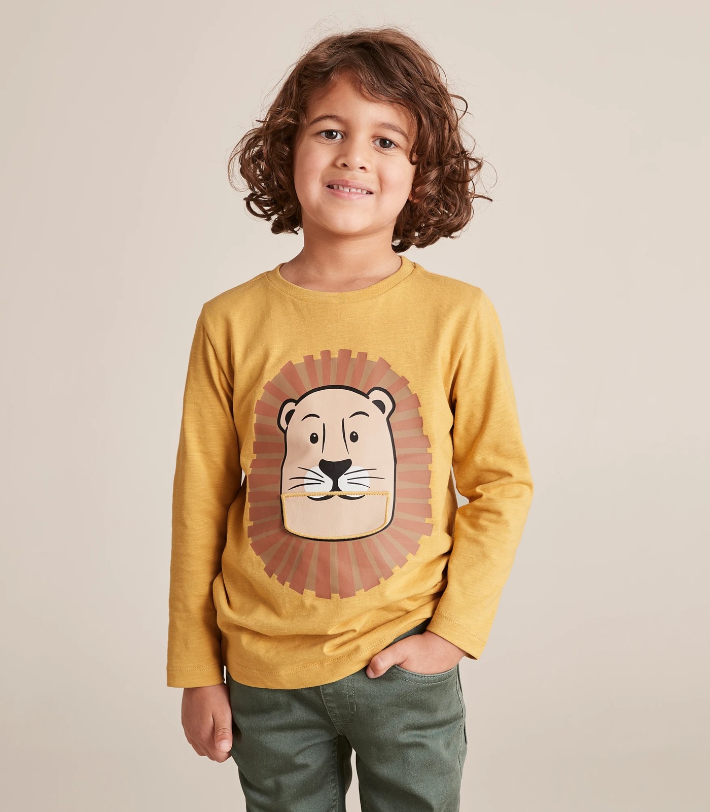He'll love the yellow Novelty Lion Top, featuring a ribbed crew neck, novelty lion print with flap to chest and crafted from soft cotton for all day comfort.