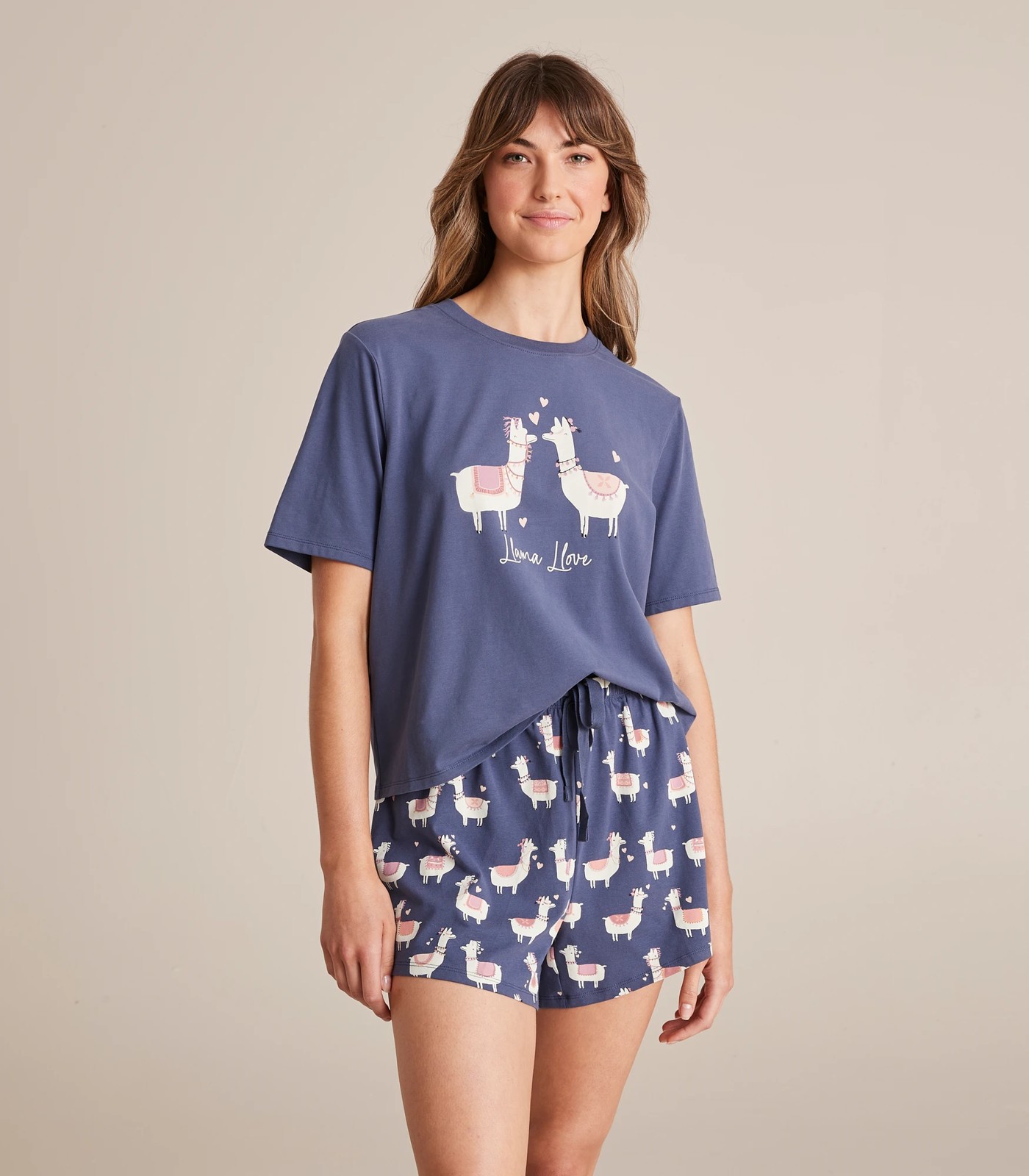 Top: round ribbed neckline, short sleeves, straight hemline; bold chest print "LLAMA LOVE"