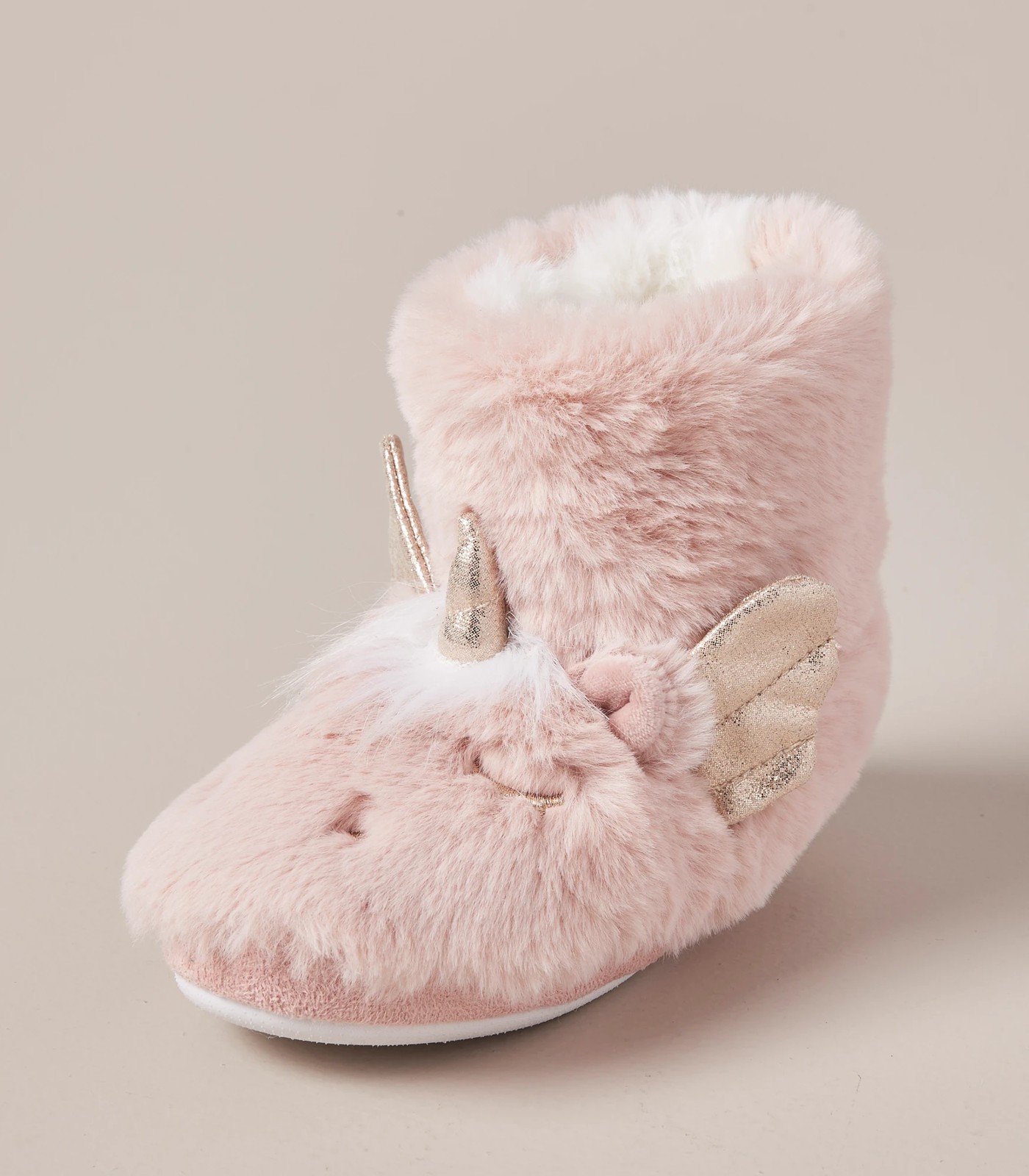 The novelty soft slipper boots are a cute addition to your childs wardrobe. They have a fluffy look, an ankle length, round toe, cute unicorn design and a easy pull on design.