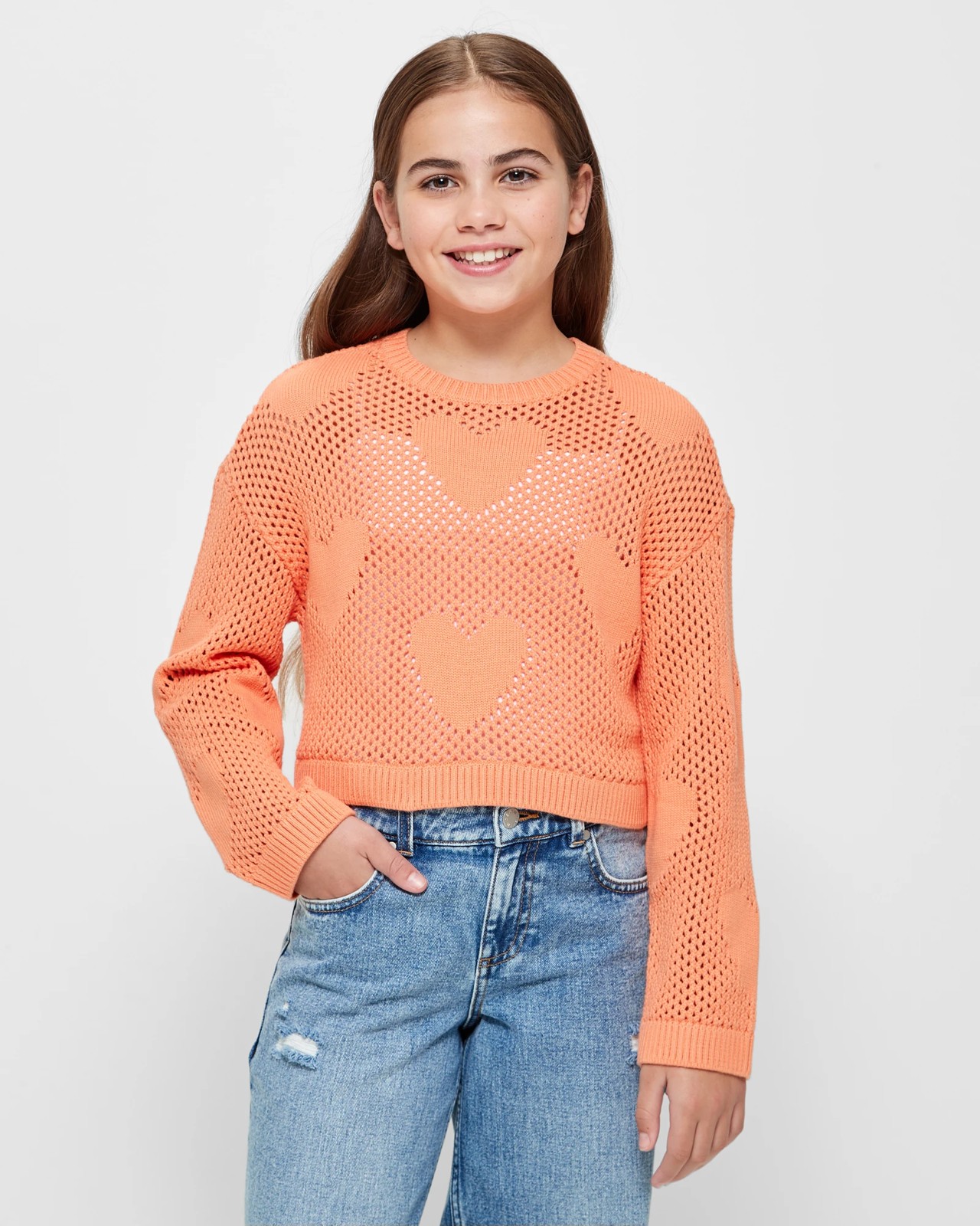 Indulge in ultimate comfort and style with our Open Knitted Crew Neck Jumper. Crafted from soft cotton knit, enjoy a slightly cropped fit perfect for pairing with your favourite high-waisted bottoms. The charming love heart open knit pattern adds a whimsical touch to your look, while the crew neck and long sleeves keep you cosy all day long. Elevate your wardrobe with a jumper that combines versatility and charm in one piece. Treat yourself to the perfect blend of fashion and comfort.