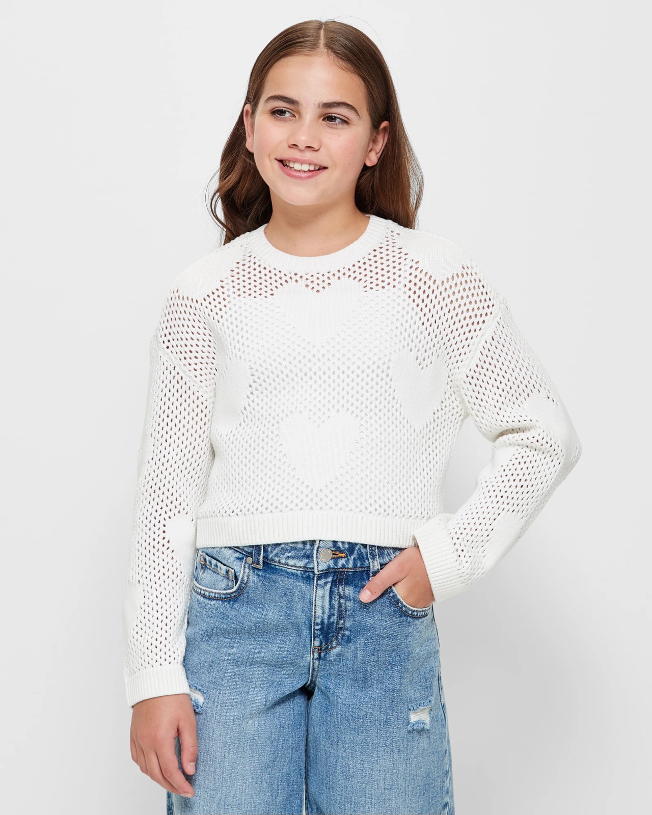 Indulge in ultimate comfort and style with our Open Knitted Crew Neck Jumper. Crafted from soft cotton knit, enjoy a slightly cropped fit perfect for pairing with your favourite high-waisted bottoms. The charming love heart open knit pattern adds a whimsical touch to your look, while the crew neck and long sleeves keep you cosy all day long. Elevate your wardrobe with a jumper that combines versatility and charm in one piece. Treat yourself to the perfect blend of fashion and comfort.