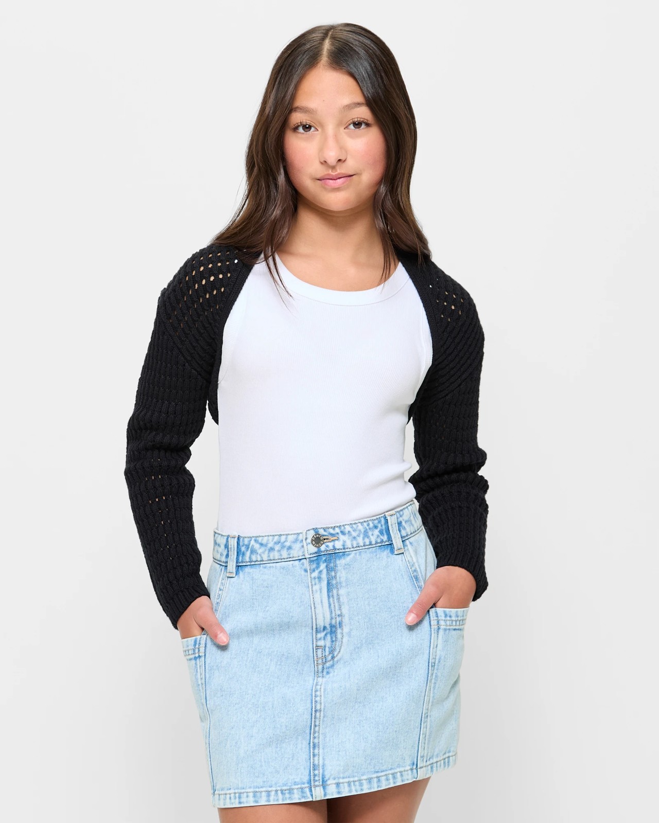 Wrap her in the effortless charm and elegance with our girls Open Knit Shrug. Made with meticulous care, this cotton crochet piece is perfect for adding a touch effortless style to any outfit. Featuring a cropped fit and long sleeves, it's the ideal layer for a breezy day. The open front design offers a relaxed yet chic shape, making it a versatile addition to her wardrobe.