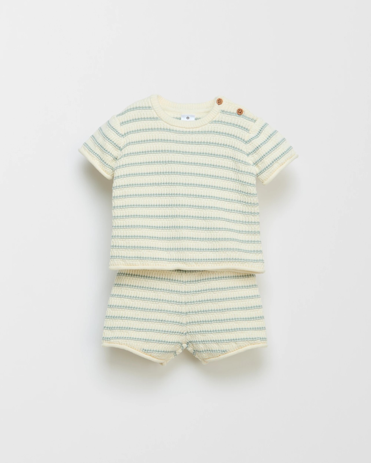 Make every day extra special for your little one with this delightful baby boy knit top and shorts set. Designed to feel wonderfully soft and gentle on delicate skin, the smooth knit texture keeps your bundle of joy comfortable whether he's playing or napping. The fresh mint stripes add a playful touch, while thoughtful details like the easy-access shoulder button and stretchy waistband make changing a breeze. Featuring a classic crew neck and drop shoulder design, this cosy set ensures your little explorer enjoys maximum freedom of movement. Whether you're heading out for a stroll or spending cosy time at home, this charming set is an ideal choice for style and comfort. Treat your baby to adorable style and reliable comfort now – brighten his wardrobe with this must-have two-piece today!