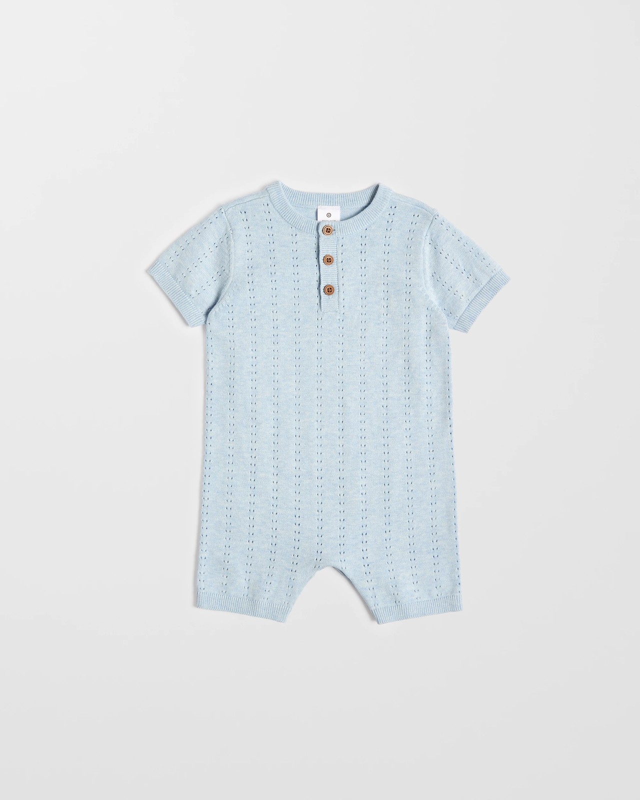 Cuddle your little one in the soft embrace of our Baby Pointelle Romper, thoughtfully designed to provide comfort throughout the day. The delicate pointelle texture ensures a gentle feel against delicate skin, adding a charming touch to every outfit. With its ribbed crew neckline and carefully finished ribbed cuffs and hems, this romper offers a stylish and secure fit for active babies. The button-down front and easy-to-use press studs at the crotch simplify dressing and nappy changes, making life easier for busy parents. The regular fit encourages little adventures while keeping your baby snug. Give your child the cosy start they deserve and make special memories together—add this adorable romper to your basket today.