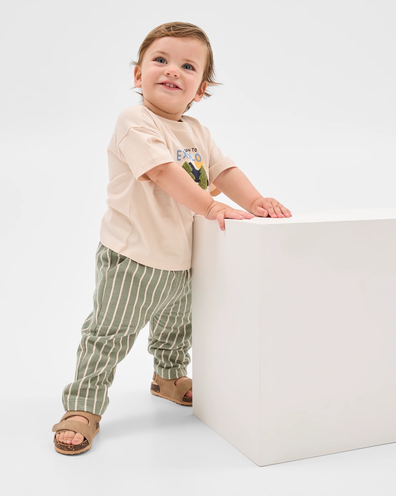 T-Shirt: organic cotton jersey rich fabrication, 160gsm, crew rib neck cotton with elastane for strecth, 240gsm, short sleeve, drop shoulder, front print "Born to Explore" with boucle texture, straight hem