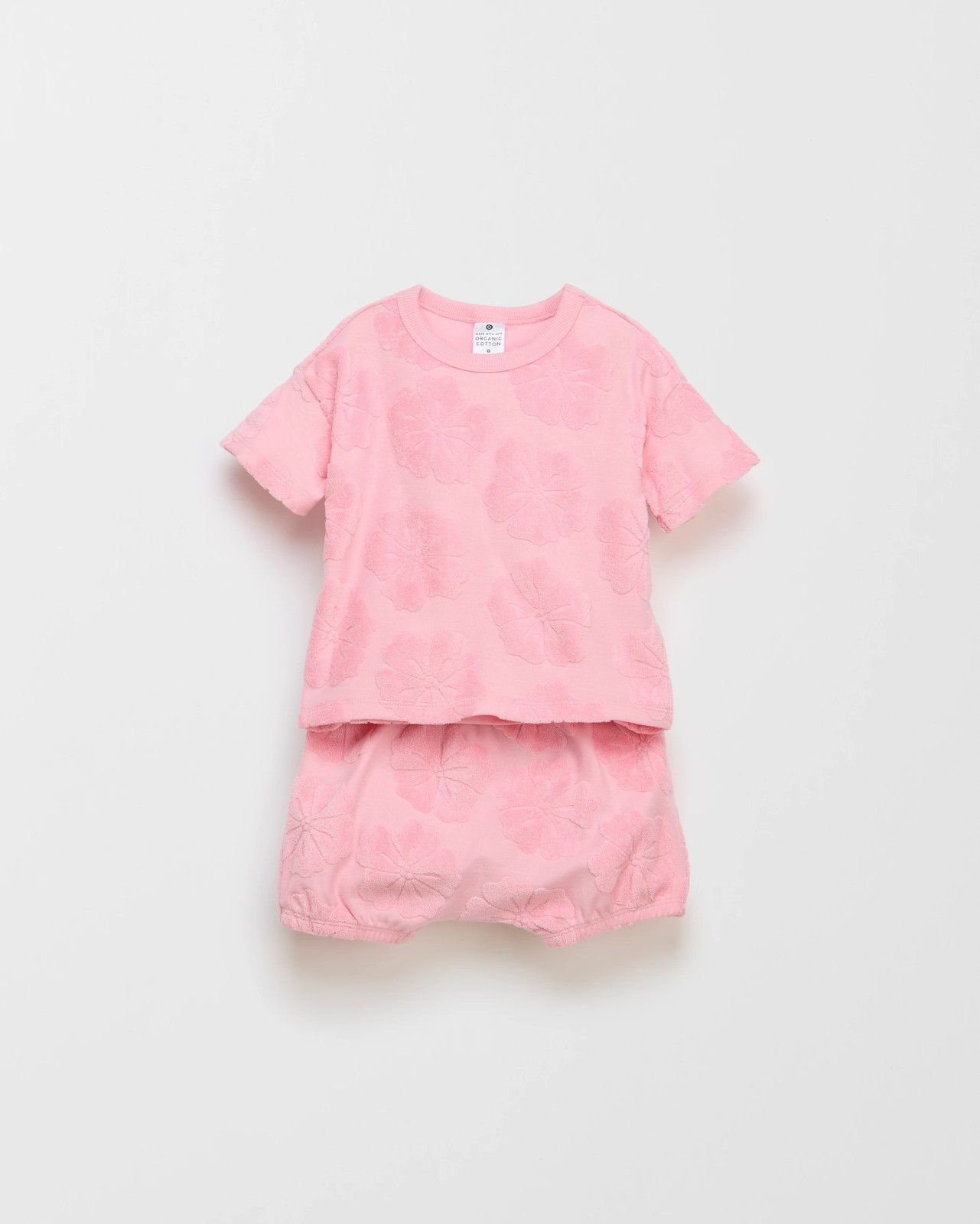 Top: ribbed crew neckline, short sleeves, drop shoulder, straight hem