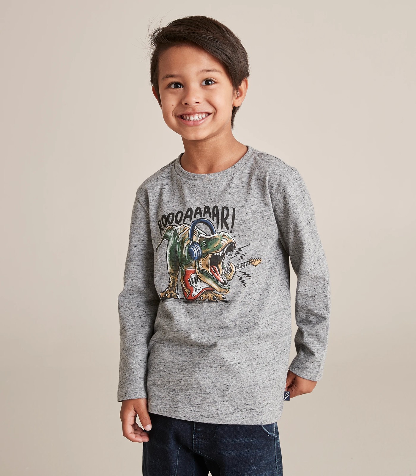 Crafted using certfied organic cotton that's grown free from harmful chemicals, is soft to touch and comfortable to wear comes the grey speckle Organic Cotton Dinosaur Print Top.