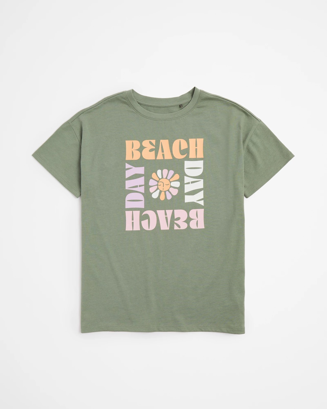 Indulge in sustainable style with our Organic Cotton Graphic Print Longline T-shirt. Made with the finest organic cotton, this girls' t-shirt features a trendy longline fit, classic crew neck, and eye-catching graphic print to the front. The short sleeves and straight hem add a casual vibe, perfect for everyday wear. Upgrade your wardrobe with this eco-friendly, fashion-forward piece today!