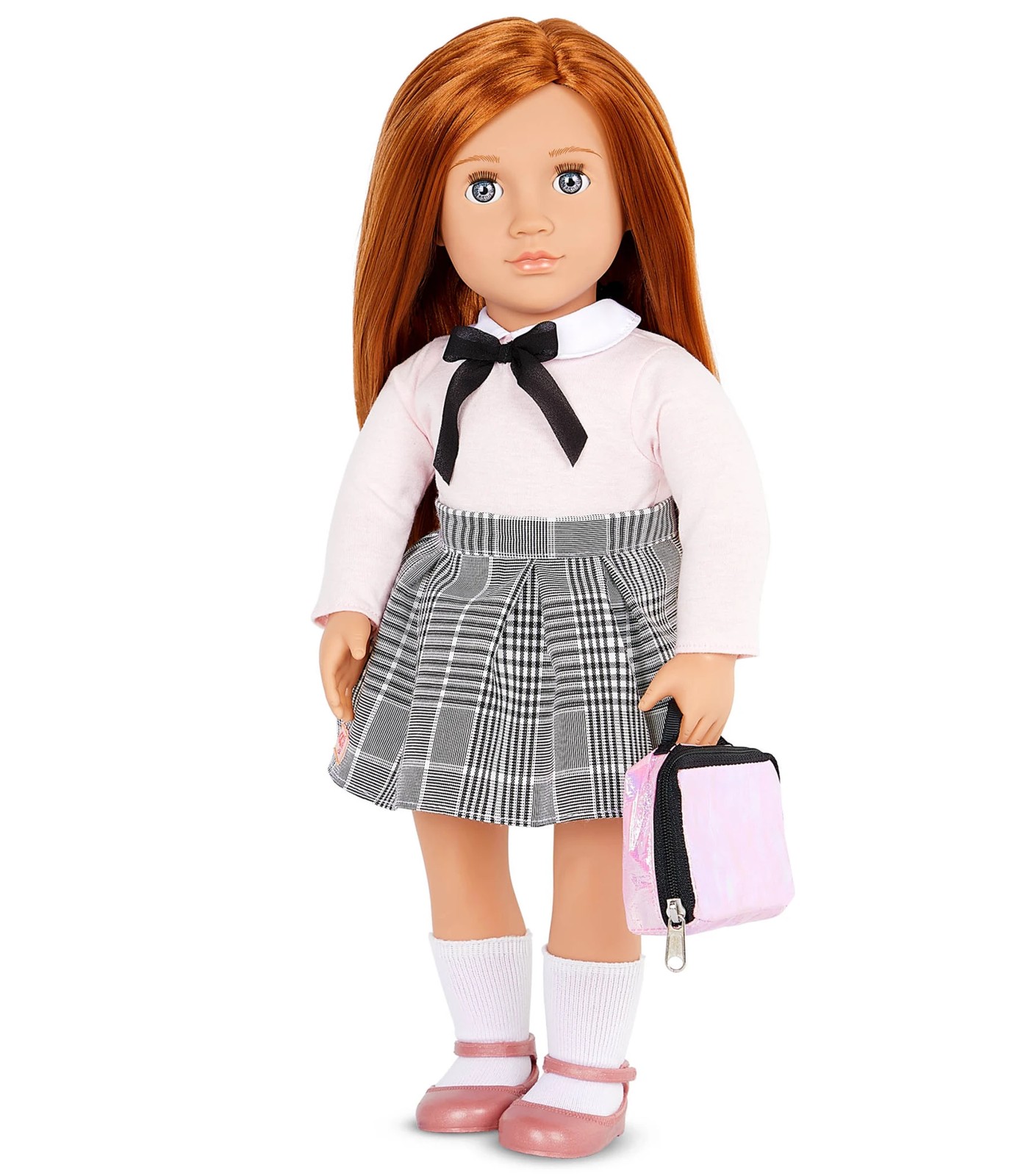 This Our Generation 18-inch doll has unique gray eyes that open and close, and her long red hair is fun to brush and style. Prepare Carly for her first day of class with the cute lunch bag accessory. it zips open to pack yummy snacks to enjoy at lunchtime! Carly can't wait to meet her new classmates. She arrives wearing a cute pink sweater with a decorative ribbon, pleated skirt, knee-high socks, and pink shoes. She has a cuddly soft body and can rotate her neck, arms, and legs to quickly change outfits. Carly's preppy uniform also features easy-open closures to quickly put on and remove, so you can give her more fun looks to match any activity!
