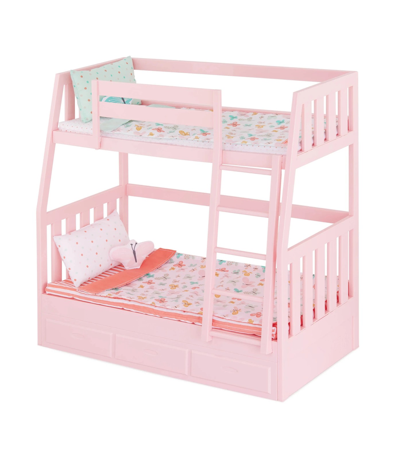 The bunk bed features a built-in ladder to reach the top bunk and is easy to assemble. Just snap the pieces together, add the mattresses and bedding, and tuck your dolls in for the night! The set includes 2 fabric-covered foam mattresses, 4 pillows, and 2 reversible blankets with cute butterfly patterns. Measuring approximately 21" (L) x 10.75" (W) x 21.75" (H), this dreamy bunk bed is a great addition to any doll's bedroom and perfect for slumber parties. Dolls sold separately.