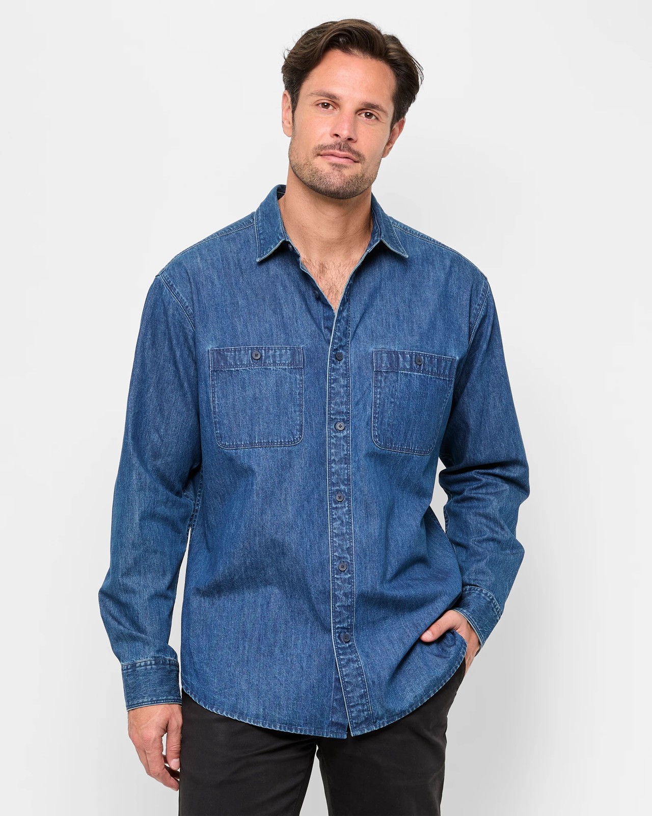 Discover effortless charm with our Oversized Long Sleeve Denim Shirt, made from soft, breathable cotton. This shirt offers a laid-back fit, featuring a round collared neckline and a button-through front for timeless style. It comes with chest pockets that have top button closures, adding a touch of practicality. The curved hemline and back centre pleat allow for extra movement, enhancing your comfort. Perfect for casual outings or relaxing at home, this shirt combines comfort with a stylish edge. Make it yours today and redefine your casual wear.