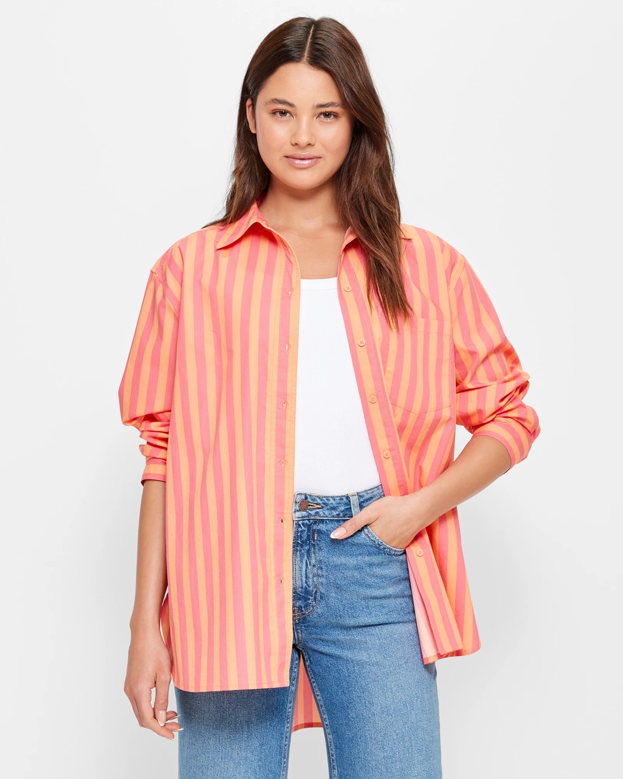 Introducing the Lily Loves Oversized Poplin Shirt. The perfect way to add a touch of effortless style to any look. Crafted from a breathable cotton poplin fabrication, this piece features an all-over striped design, round collared neckline, button through front and long cuffed sleeves. It also includes a chest pocket and curved high-low hemline for added interest, as well as a back centre pleat for ease of movement. Wear yours with jeans and sneakers for an easy weekend look.