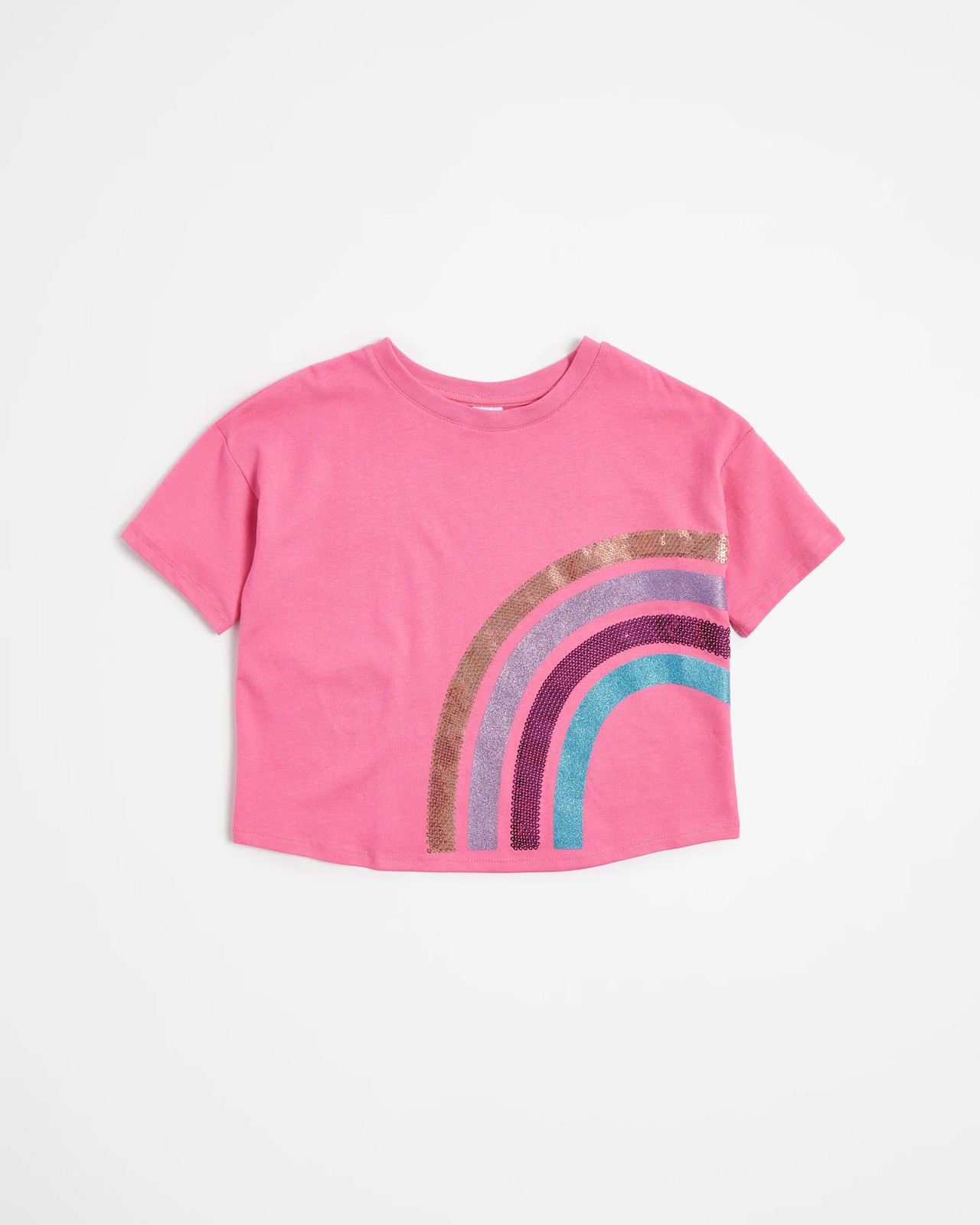 Step into the spotlight with our oversized Sequin Rainbow T-shirt! Made from a comfortable cotton-rich fabric, this t-shirt features an oversized fit that suits any activity. The eye-catching pink colour and ribbed crew neck add a stylish touch. The short sleeves keep you cool and comfortable, while the sequin rainbow print on the front adds a playful and vibrant element. Whether they're heading to a party or simply want to brighten up their everyday style, this t-shirt is the perfect choice.