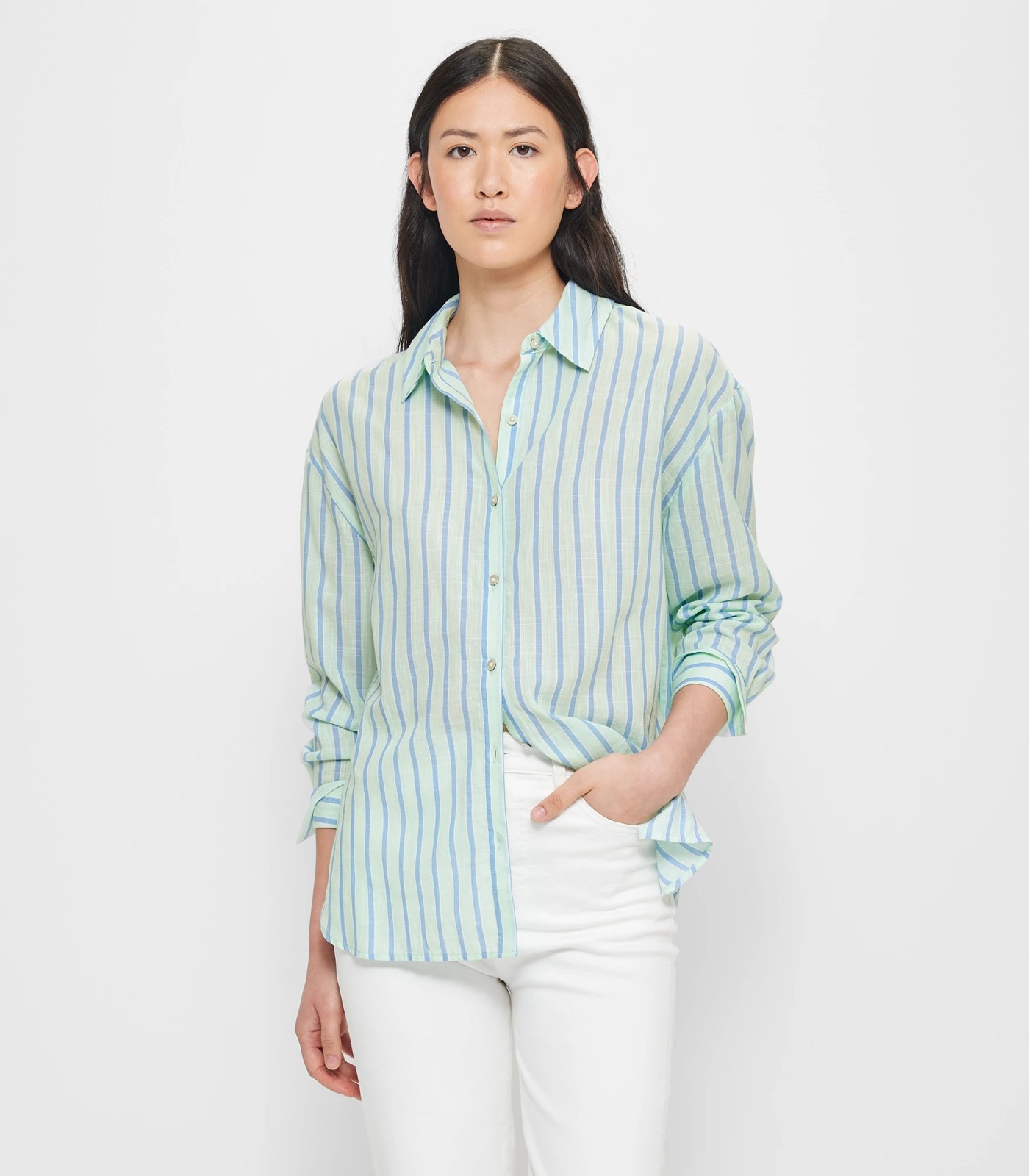 This Oversized Shirt is a must-have addition to your wardrobe. Made from a soft and breathable cotton fabrication, it offers ultimate comfort throughout the day. The oversized fit gives it a relaxed and laid-back look, perfect for casual outings. With its stylish green/blue/white striped design, this shirt adds a touch of elegance to any outfit. The round collared neckline and button-through front provide a classic and timeless style. The long button cuff sleeves add a chic touch, and the high-low hemline adds a modern twist. The back centre pleat ensures added movement and flexibility. Get yourself this Oversized Shirt and experience effortless style and comfort.