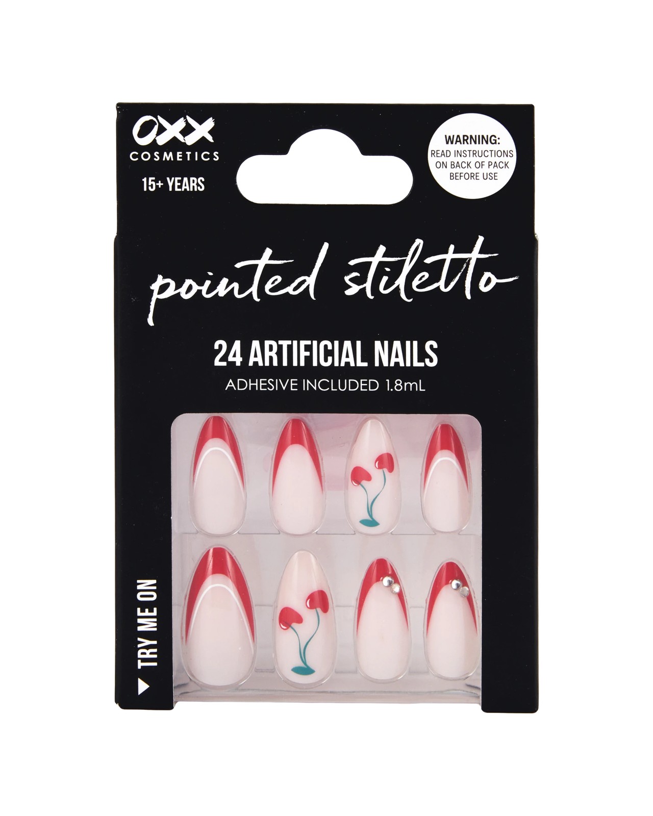 Transform your nails at home with the OXX Cosmetics 24 Pack Artificial Nails with Adhesive, featuring a stunning cherry-red colour and dramatic pointed stiletto shape. These stylish nails come complete with adhesive for easy application, letting you achieve a salon-inspired look in minutes. The lustrous glitter detail adds a glamorous touch to every fingertip, making everyday moments feel that little bit more special. With 24 nails in the set, you can customise your look to suit your mood or occasion, all without the hassle or cost of a salon appointment. Unleash your inner confidence and express your style effortlessly. Try them today for a flawless manicure that lasts.