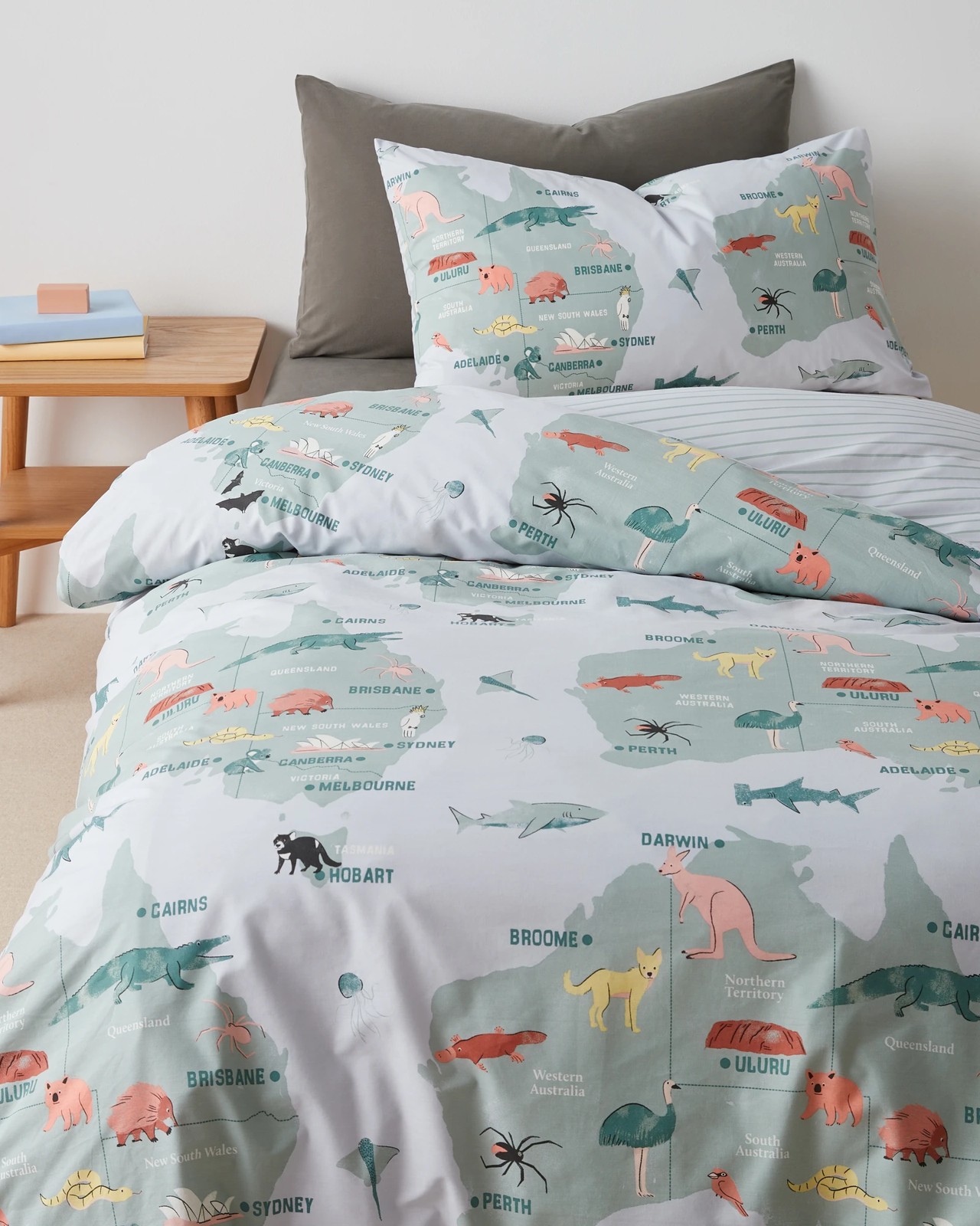 Transform your bedroom into an Australian adventure with the Ozzy Map Quilt Cover Set. Made from soft cotton, this cover features a versatile reversible design, displaying a lively map of Australia with its indigenous animals on one side and a chic stripe pattern on the other. The tailored knife edge finish adds a polished look, and maintenance is a breeze thanks to its machine washable quality. Embrace the unique blend of style and comfort in your sleep space. Don't wait, update your bedding with this delightful set today!