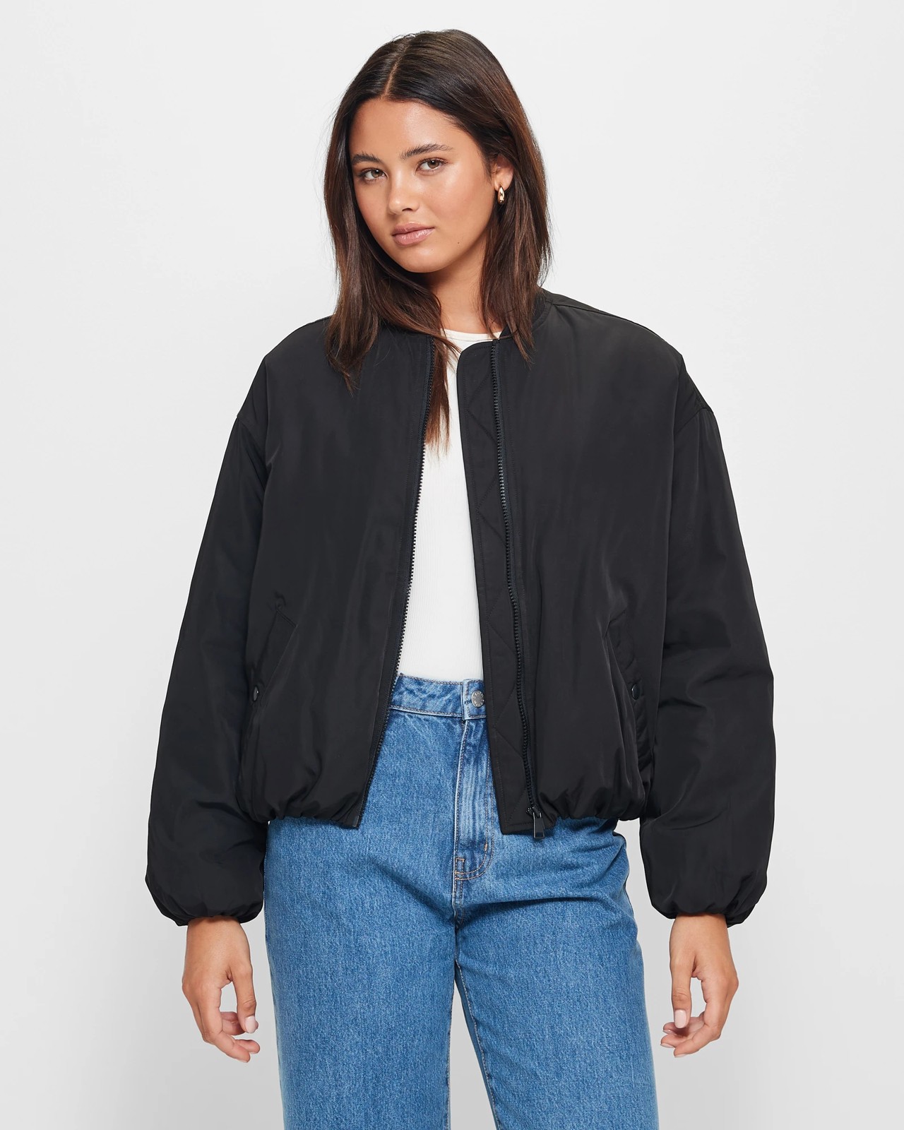 Stay stylish and cosy with the Padded Bomber Jacket from Lily Loves. This jacket is made from a polyester fabrication, with recycled materials for an eco-friendly touch. The regular fit and classic bomber style make it versatile and easy to pair with any outfit. It features a ribbed round high neckline and long sleeves with inner elastic cuffs for added comfort. The zip through front and side pockets with snap button closure provide convenience and functionality. The inner elastic straight hemline adds a stylish touch. Update your wardrobe with this trendy jacket and make a fashion statement wherever you go. Get yours now!