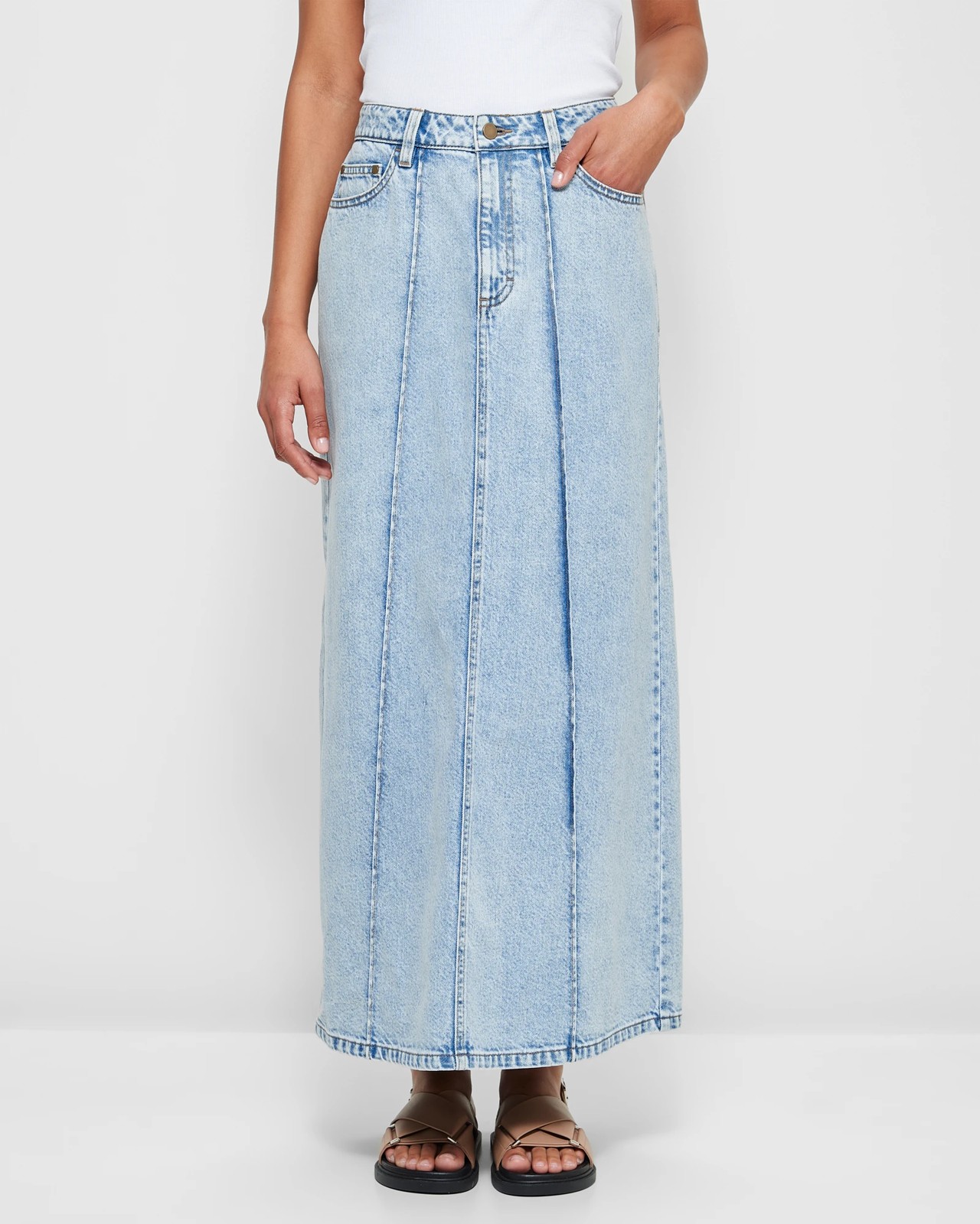 Step into style and fashionability with our Panelled Denim Maxi Skirt. Crafted from a blend of cotton and recycled materials, each detail tells a story of quality and conscience. The structured waistband and elegant panelling offer a flattering silhouette, while the back centre bottom split adds a touch of modern flair to the classic design. Ideal for any occasion, pair with your favourite top and accessories for an effortlessly chic look that will turn heads.
