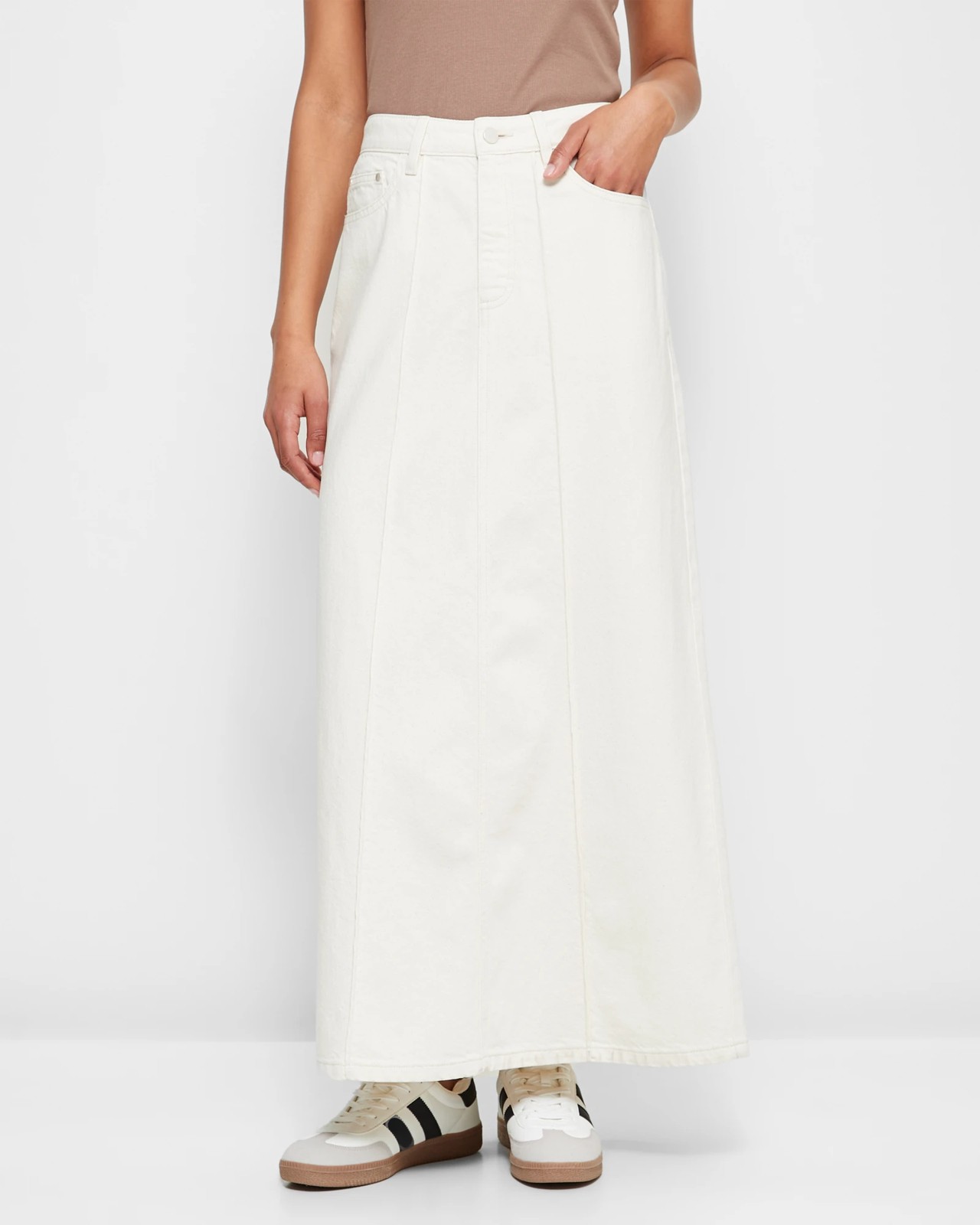 Indulge in a chic and versatile style with our Panelled Denim Maxi Skirt. Crafted from premium cotton and featuring recycled materials, denim has never looked so fashionable. The structured waistband, button and zip fly closure, combined with classic panelling and a maxi length, exude a timeless and elegant appeal. Perfect for any occasion, whether a casual day out or dressed up with accessories for a night on the town. Elevate your wardrobe with a skirt that's as stylish as you are.