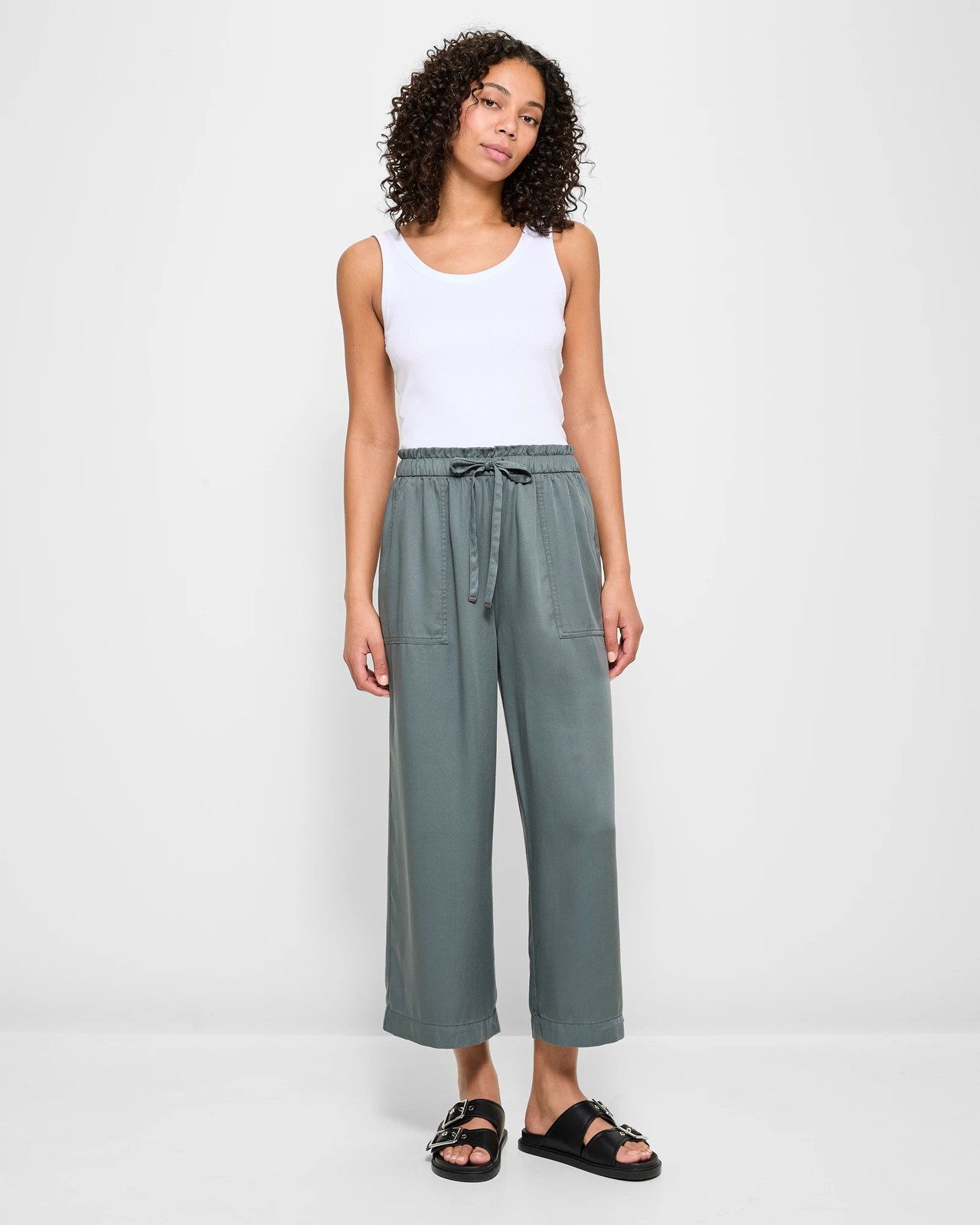 Step out in style with these Paperbag Culotte Pants that effortlessly blend comfort and chic. Made from a smooth lyocell fabric, these pants feature a high-waist with an elastic paperbag waistband and drawstring for a snug yet flexible fit. The large front pockets add a touch of functionality, while the wide-leg and cropped length provide a contemporary look. Perfect for any casual outing or dressed-up occasion, these culottes are designed to make heads turn. Don't miss out on adding this versatile piece to your wardrobe.
