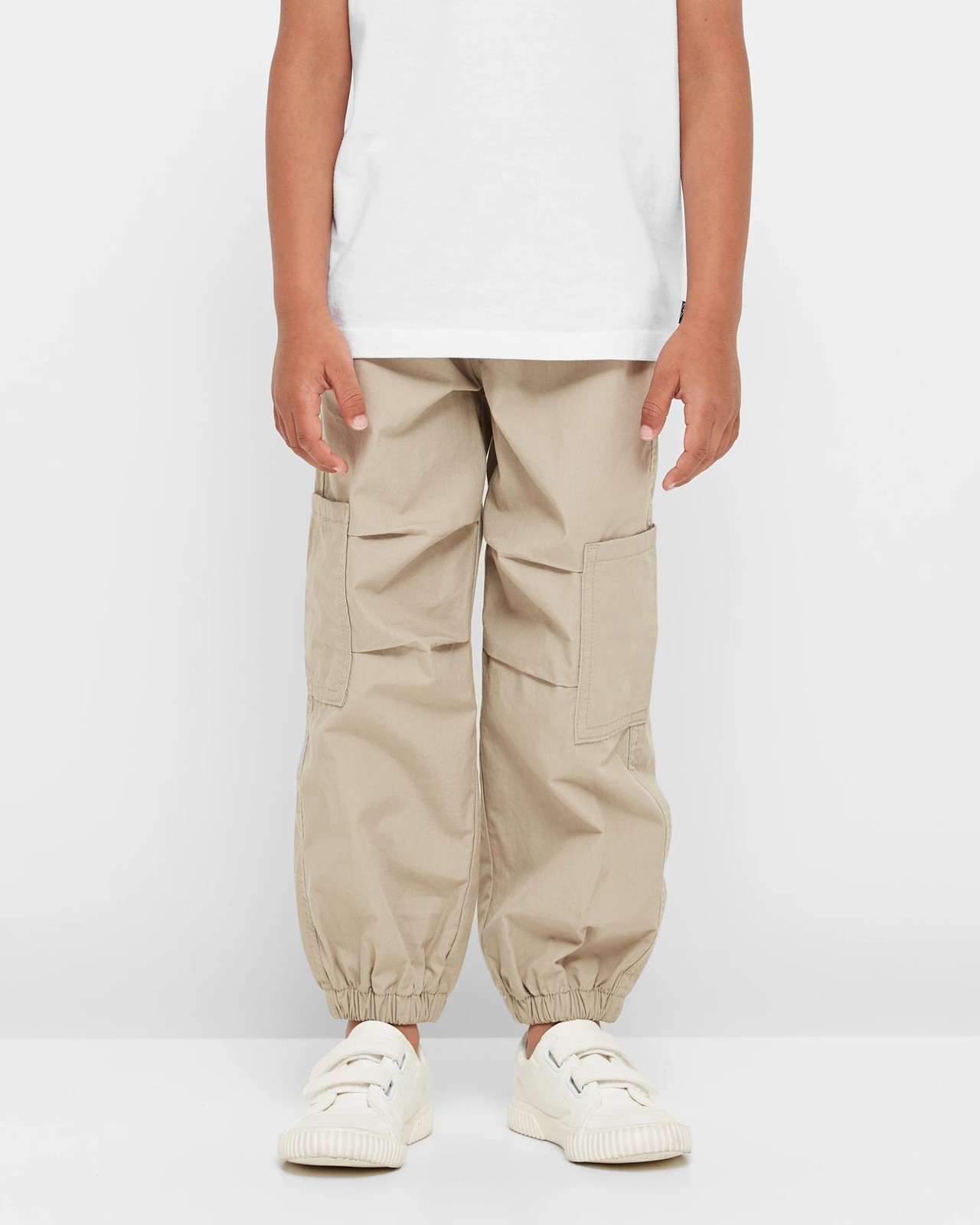 Introducing our Boys Parachute Pant in a stylish light tan hue. Crafted from premium cotton, these regular fit pants offer the perfect combination of comfort and style. The elastic waistband ensures easy wear, while the side pockets provide a convenient place to store small essentials. These pants also feature two thigh utility pockets for an added touch of functionality. The elastic cuffs add a trendy and modern look. Whether your little one is playing outdoors or having a relaxed day at home, these pants are the perfect choice. Upgrade their wardrobe with these versatile and comfortable parachute pants today!