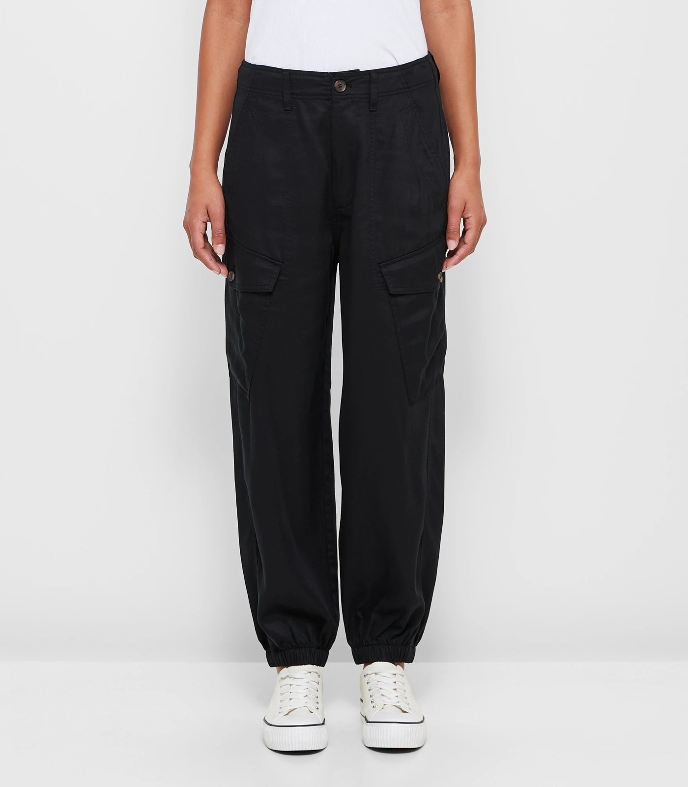 Embrace comfort and style with our Parachute Pants. Crafted from a luxurious lyocell fabrication, these trousers are both lightweight and soft, ensuring all-day wearability. The regular fit, mid rise waist, and structured waistband with belt loops provide a flattering silhouette, while the front button and zip fly closure ensure a secure fit. Featuring convenient side pockets, angled thigh fold over top side pockets with button closure, and relaxed legs, these ancle-length trousers are finished with elastic cuffs for a contemporary touch. Complete with back pockets with fold over top and button closure, our Parachute Pants offer the perfect blend of practicality and fashion. Elevate your everyday outfits with these versatile and stylish trousers.