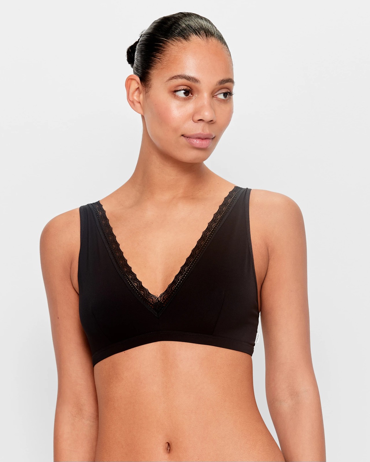 Be stylish and comfortable with our Jockey Parisienne® Wirefree Bralette. This bralette is made with recycled nylon that is stretchy for comfort. It features a beautiful French-inspired lace trim around the chest, thick front shoulder straps and thin back adjustable straps for a perfect fit. The V plunge neckline gives it a unique look that will be sure to make heads turn. Get ready to enjoy all day comfort with our Jockey bralette!