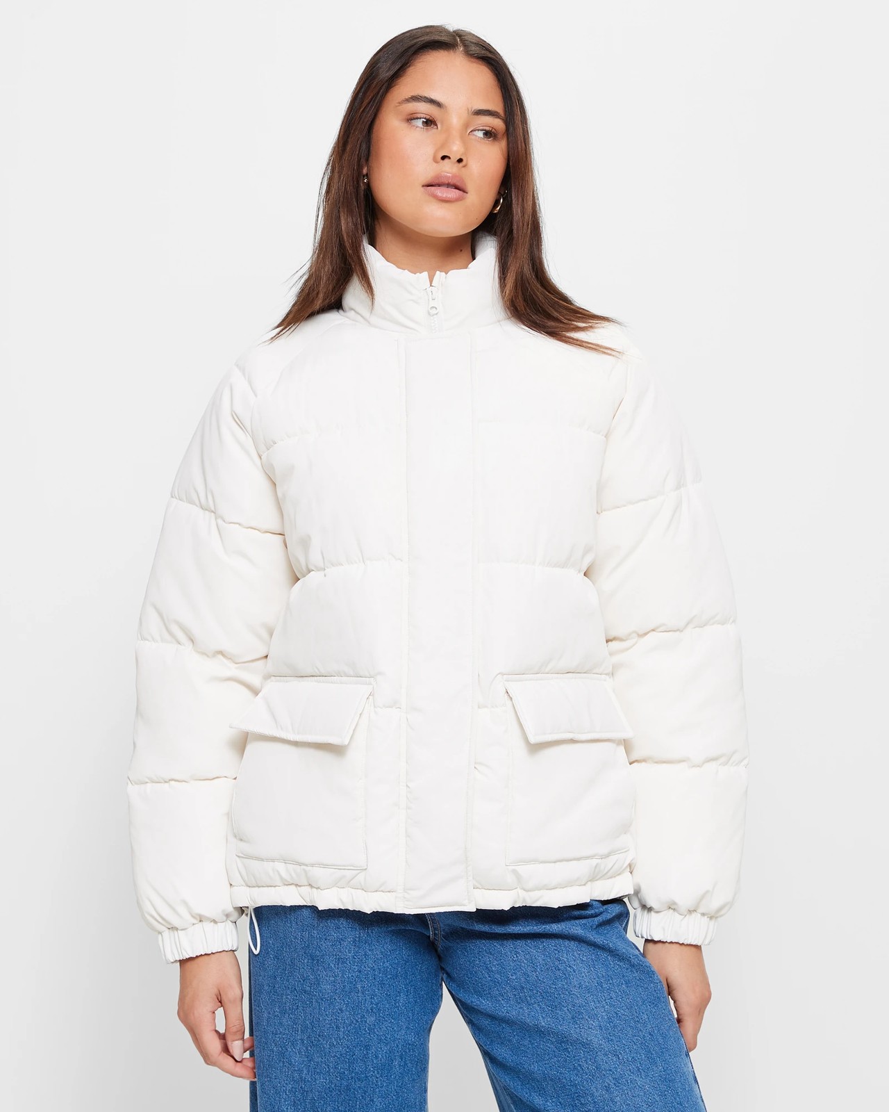 Introducing the Patch Pocket Puffer Jacket from Lily Loves. This trendy jacket is made from a high-quality polyester fabrication, which includes recycled materials, to ensure both style and sustainability. Designed in a regular fit, it features the classic puffer style that is both fashionable and practical. The round high neckline and zip through front with a flap over zipper provide extra warmth and protection. The long elastic cuff sleeves and fold over top front pockets with press stud closure add a stylish touch. Complete with a straight hemline and an inner toggle pull for a change in style, this mid-length jacket is a must-have for any fashion-forward individual. Upgrade your winter wardrobe today!