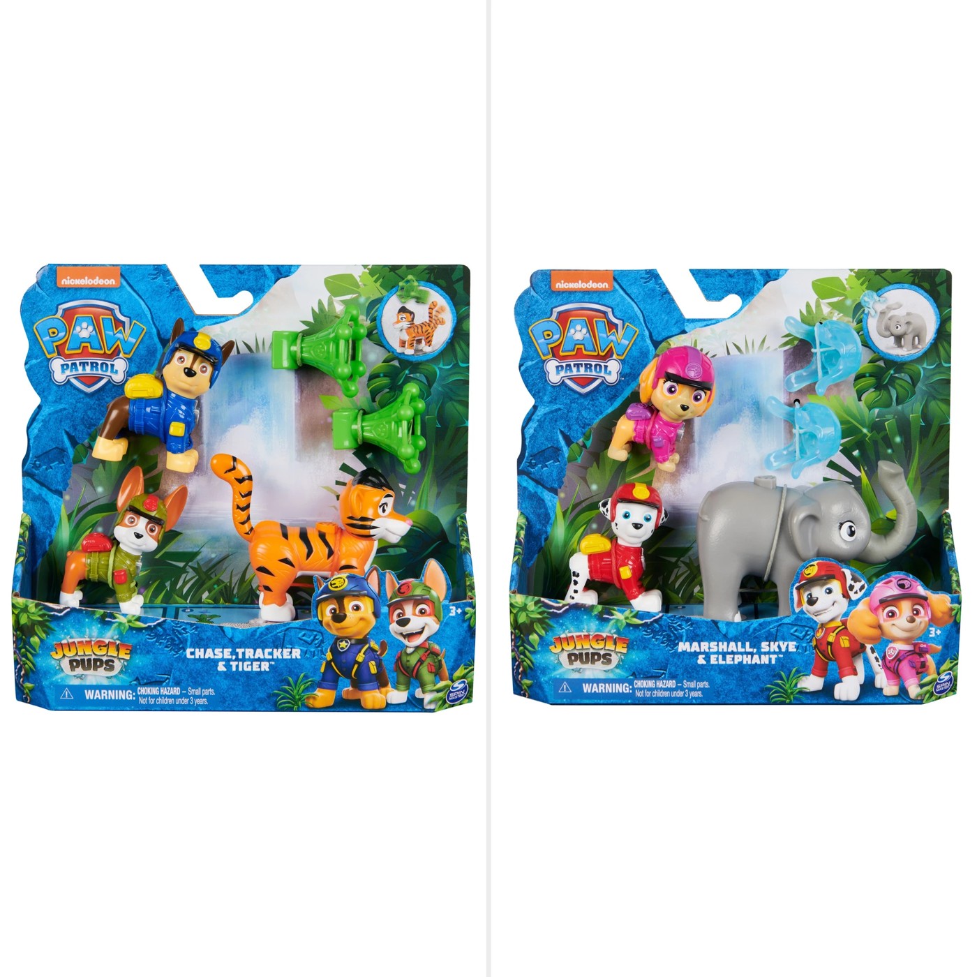 For even more fun and exciting PAW Patrol series-inspired missions, collect all the PAW Patrol Jungle Pups toys and the PAW Patrol: The Mighty Movie toys, like the awesome Aircraft Carrier HQ and all the special edition PAW patrol toys for girls and boys, like the Mighty Pups, Aqua Pups and Big Truck Pups toy figures and playsets (each sold separately). With PAW Patrol preschool toys, a kid can explore her or her imagination, and develop their motor skills through pretend play, as they relive their favorite scenes from the shows. Enjoy endless PAWsome adventures with the Jungle Pups Marshall, Skye & Elephant figure set! Create your own PAW Patrol: Jungle Pups adventures with Chase & Tracker & their tiger pal! Chase, Tracker and tiger stand over 2 inches tall and look just like they do in the show! When it’s time for an exciting rescue, attach the net projectile to tigers tail and pull the tail back into position, then press the button to launch and save the day! Use your imagination to re-create your favorite episodes from PAW Patrol: Jungle Pups or create entirely new missions! For even more fun and exciting PAW Patrol series-inspired missions, collect all the PAW Patrol Jungle Pups toys and the PAW Patrol: The Mighty Movie toys, like the awesome Aircraft Carrier HQ and all the special edition PAW patrol toys for girls and boys, like the Mighty Pups, Aqua Pups and Big Truck Pups toy figures and playsets (each sold separately). With PAW Patrol preschool toys, a kid can explore her or her imagination, and develop their motor skills through pretend play, as they relive their favorite scenes from the shows. Enjoy endless PAWsome adventures with the Jungle Pups Chase, Tracker & Tiger figure set!<br />